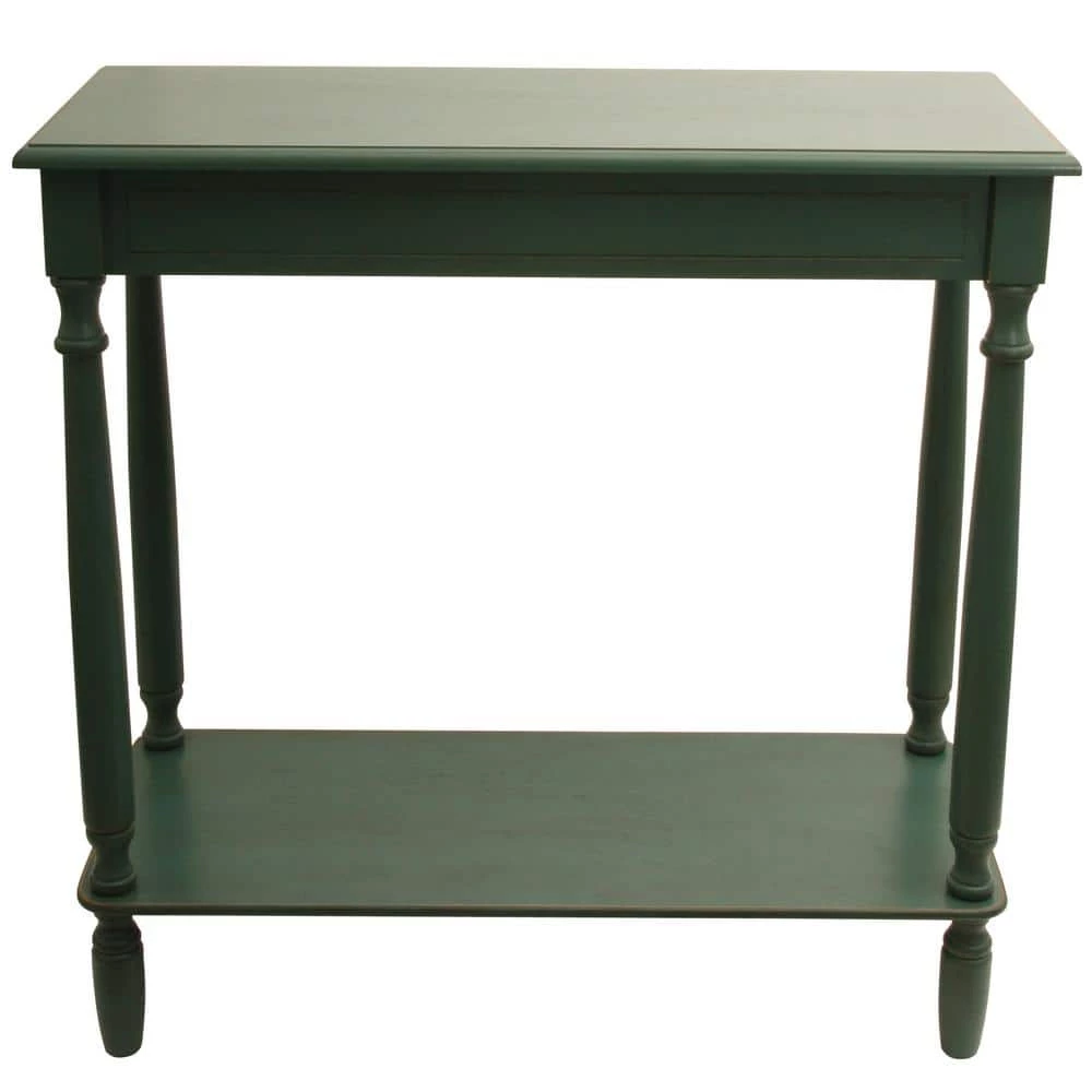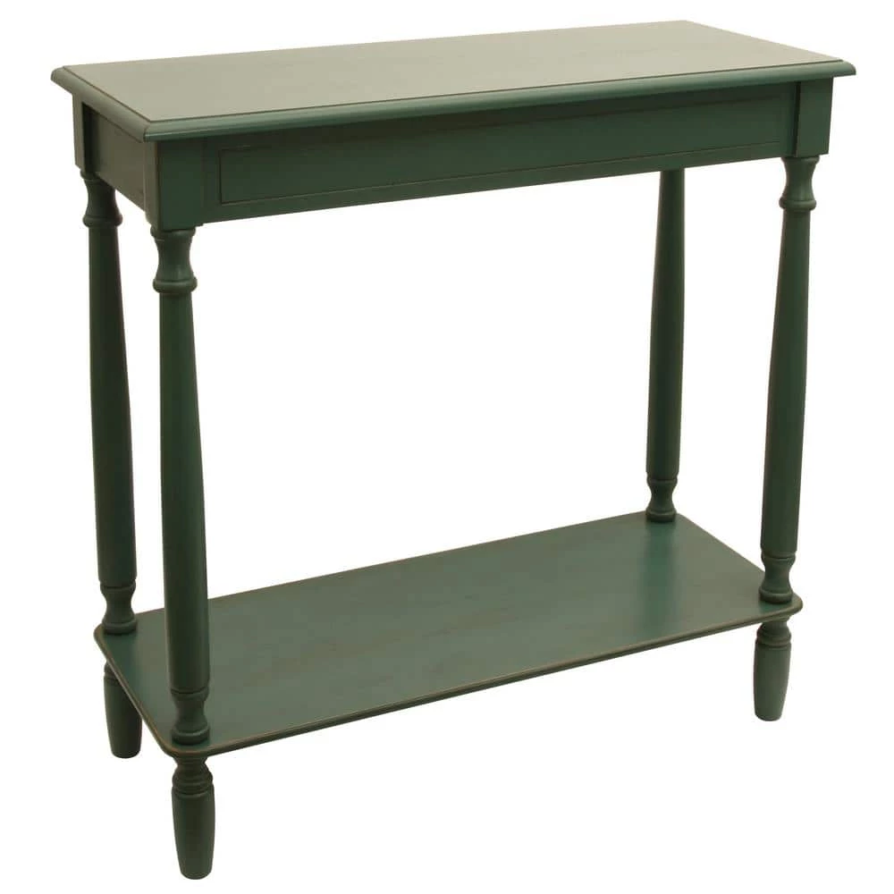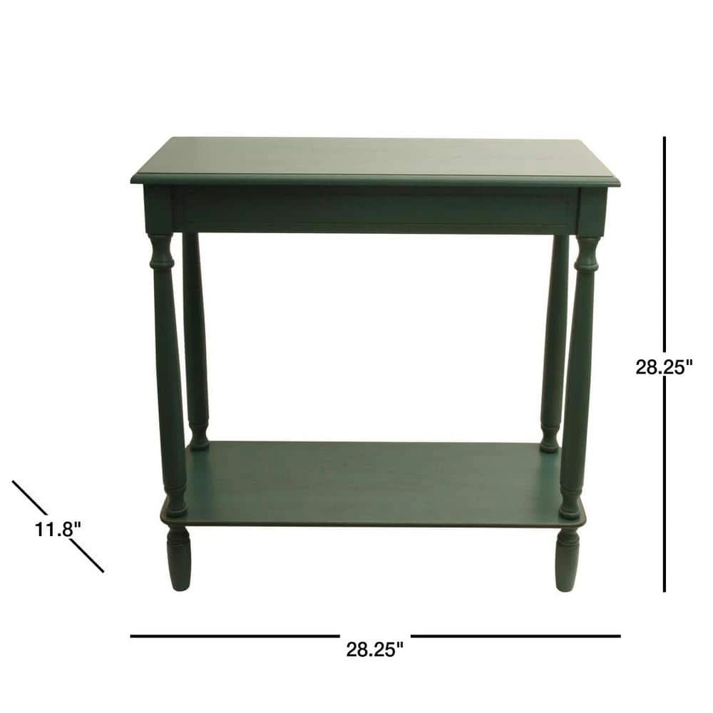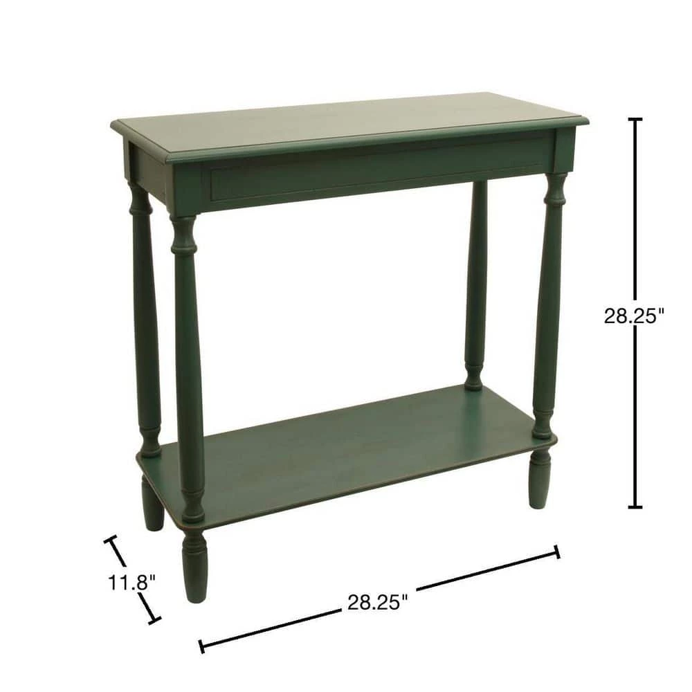 This rectangular Console Table is simple yet elegant. Turned legs and finish give this accent table a timeless, traditional and grand feel. Place it under a mirror in your entry way, use it in the dining room to provide extra serving space or display a collectible. The lower shelf is ideal for showcasing baskets or books. Constructed of solids and MDF for a long lasting, durable piece. Easy to assemble. Table measures 28.25 in. x 11.8 in. x 28.25 in. Available in Walnut, antique teal, and antique white.