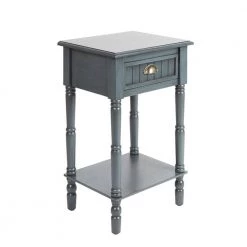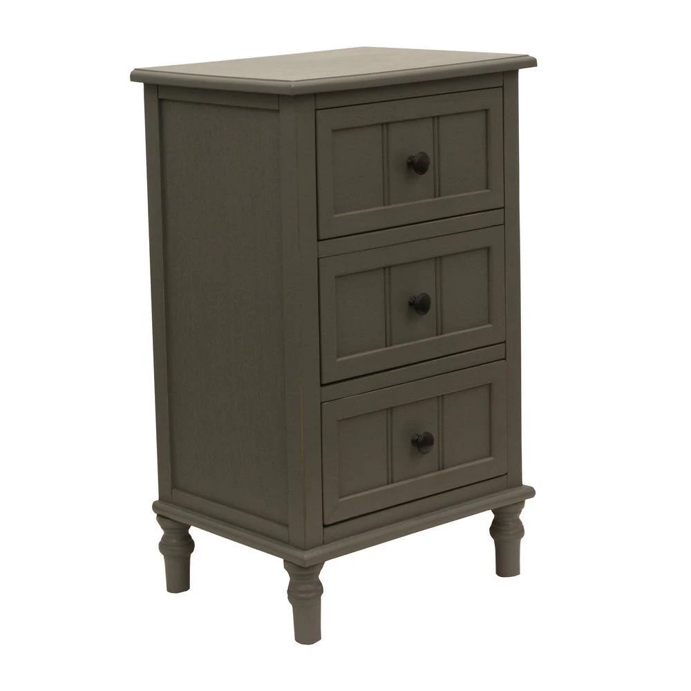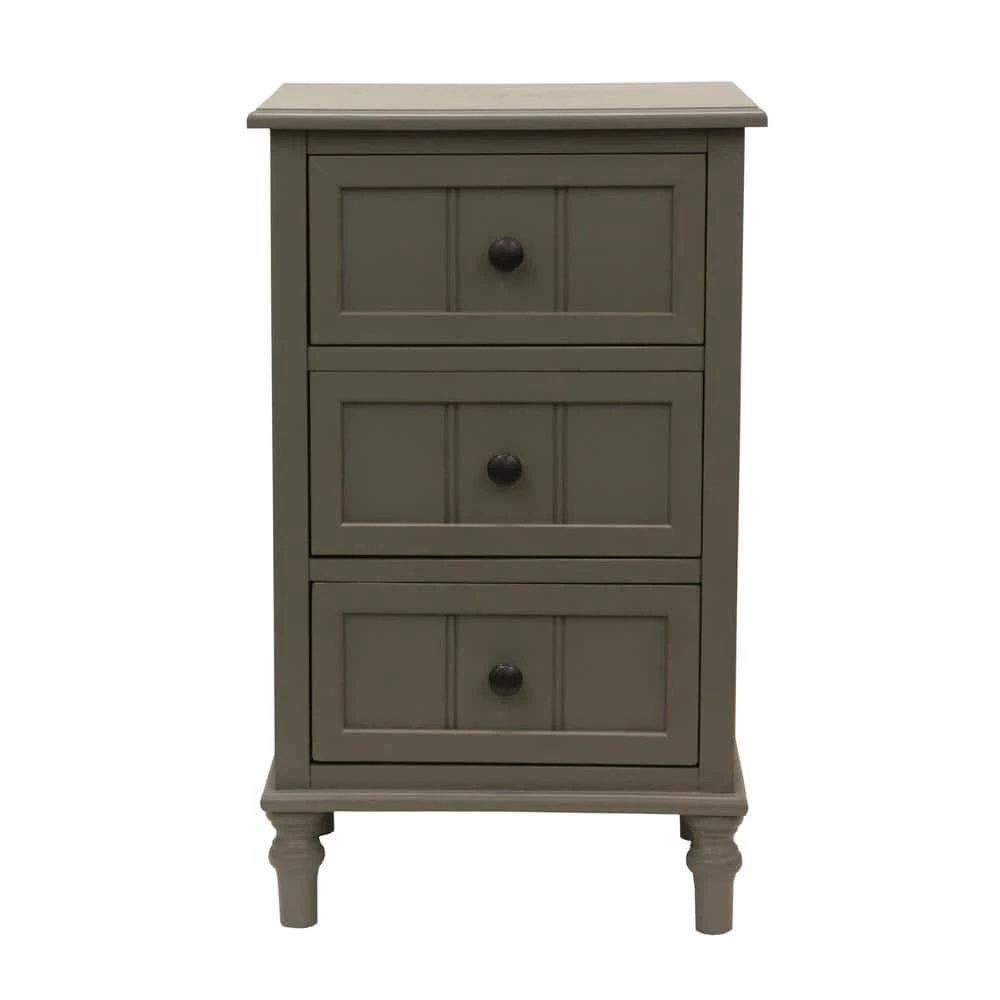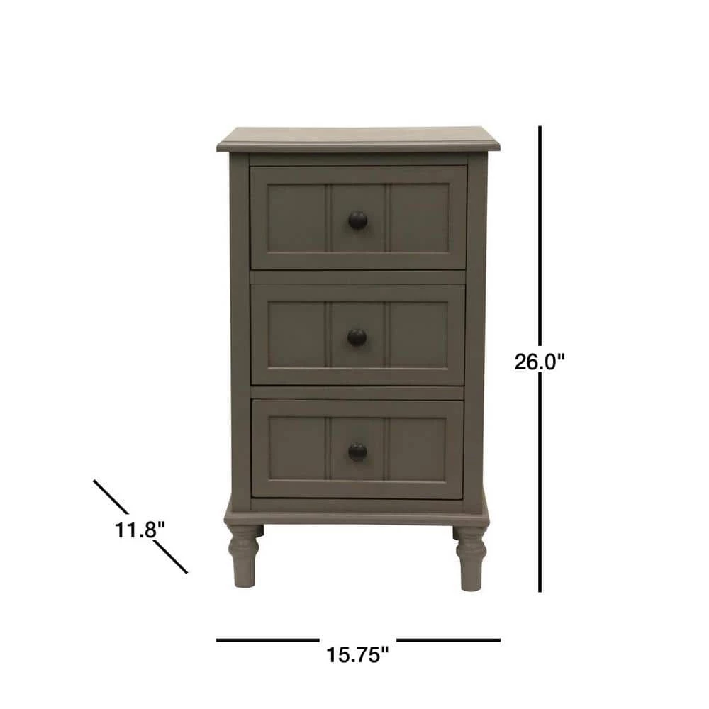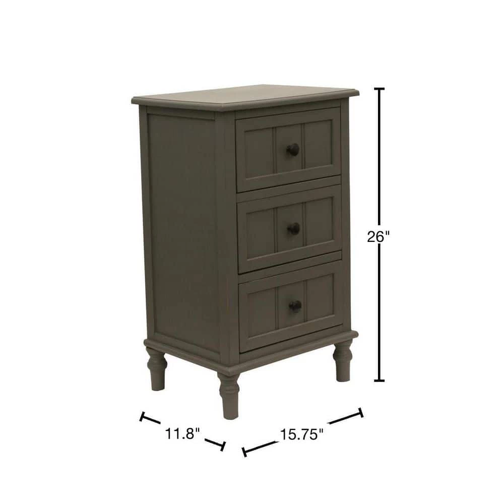 Design and functionality meet in harmony with the Three Drawer Accent Table. This accent chest can be used to as an end table next to your sofa to showcase a table lamp, or in an office to store supplies. It has a timeless buttermilk finish that could be transitional for any decor. Constructed of sturdy solids and MDF. Table measures 15.75 in. x 11.8 in. x 26 in. Available in off white and eased edge gray finish.