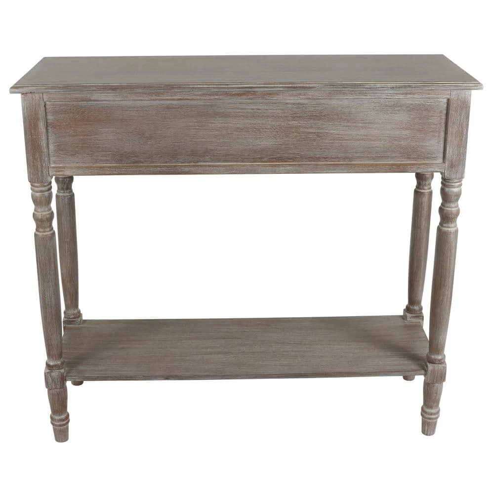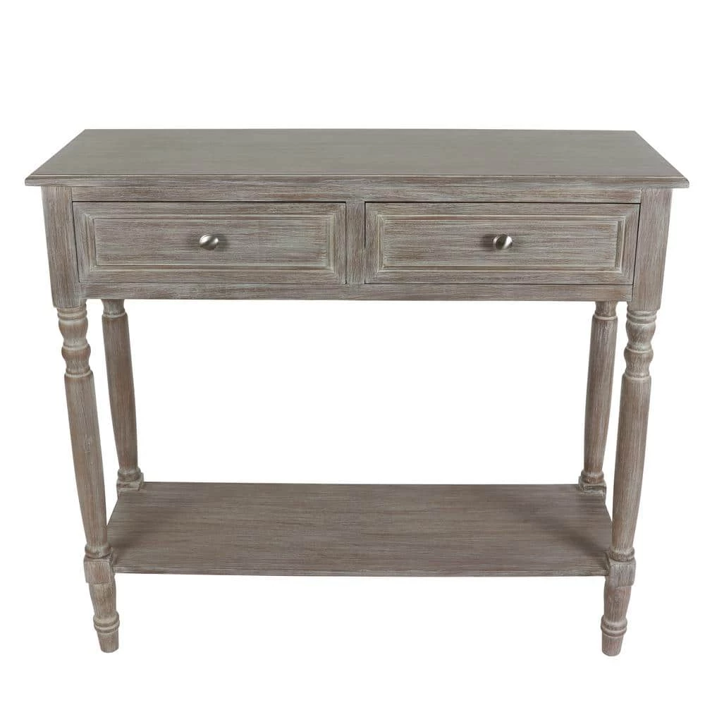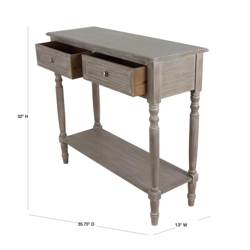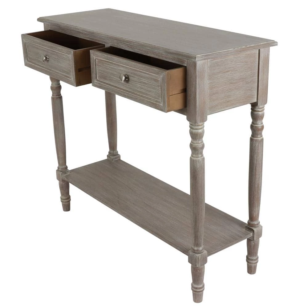Great console table for a small space. This product is constructed of wood and offers two storage drawers and a storage shelf. The natural wood farmhouse design provides a great design element and is further complimented by the great stainless-steel hardware.