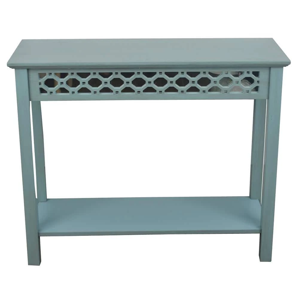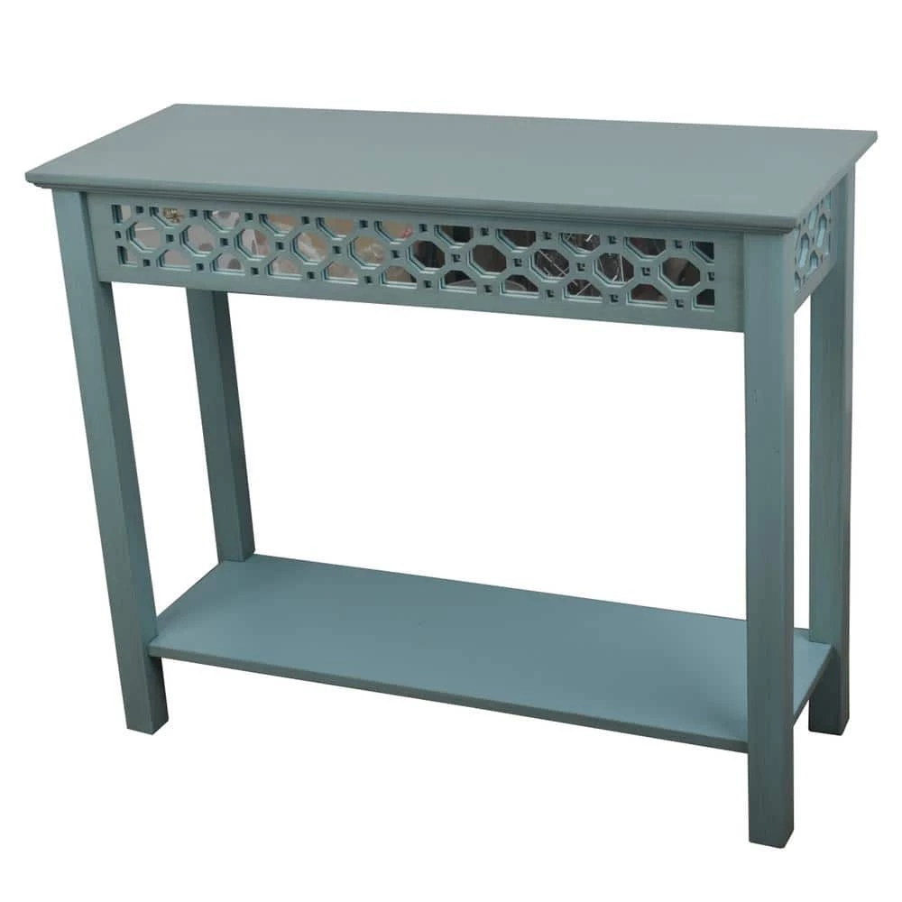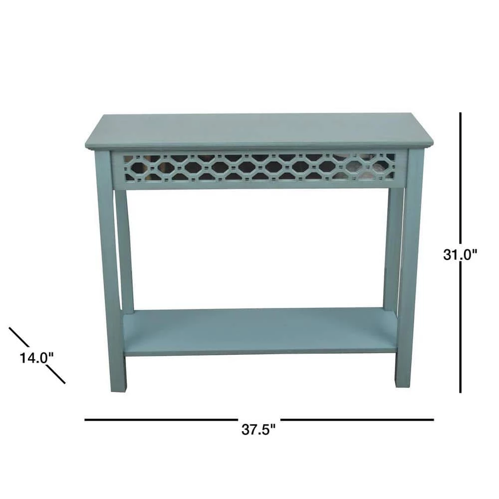 Elevate the look of your living space by adding a detail-focused statement piece such as our Mirrored Console Table. The mirrored front will reflect light, making your room look lighter. Featuring an intricately designed, mirrored table skirt for an eye-catching look. A lower shelf provides additional storage space. Constructed of wood, this modern sofa table will add a playful pop of color, functionality and organization to your home. Easy to assemble. Measures 37.5 in. x 14 in. x 31 in. Available in Iced Blue and Winter Wood finish.