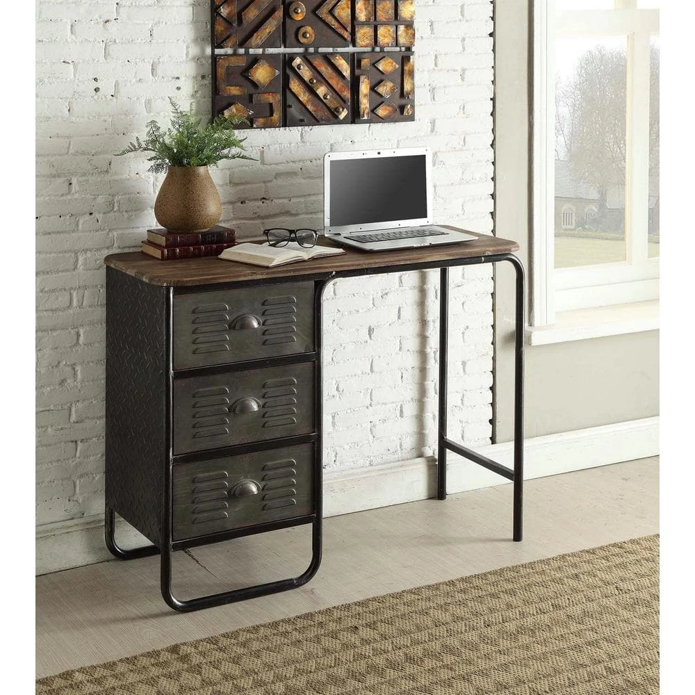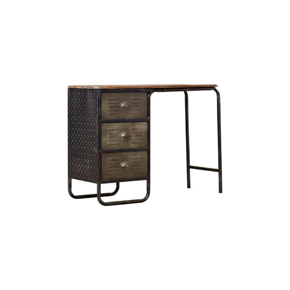 This urban designed Calico Collection Desk, is great storage for any room in the house. This storage item is a uniquely designed locker style with fluted doors which open on pivot hinges and close with a magnetic catch. The large storage area is great for all of your storage needs. Each drawer opens on easy glide metal slides and is constructed of metal on all sides. The sides of this desk are finished with an industrial diamond metal plate which adds to the industrial look. The time worn feel of the desk top and the contoured edges give this item a distinct look adding to the overall design. Goes great with the matching Calico Collection Bookcase and Swivel Stool. Partial assembly required. Clean with a dry non-abrasive cloth.