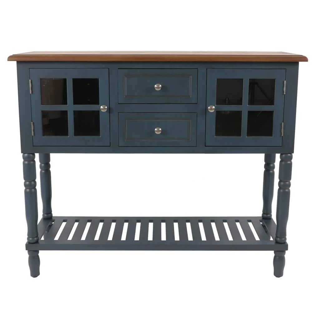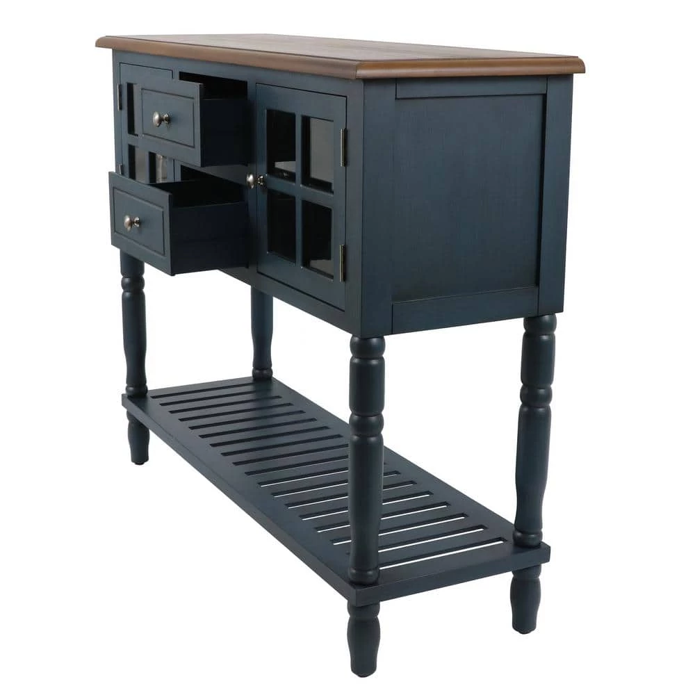 Traditional design and timeless character are the building blocks upon which the Morgan Console Table was designed. The quintessential transitional table that blends classic styling, modern updates, versatility and function. 2 drawers provide an out of sight storage place for unsightly clutter. Stylishly house belongings in the 2 cabinets, each featuring a glass window frame door that adds charm to your living space. A slatted shelf expands your storage capability. A versatile piece that can be used as an entryway table, living room accent table or in a dining room as a buffet server. Measures 42 in. x 14 in. x 34.25 in. Constructed of wood.