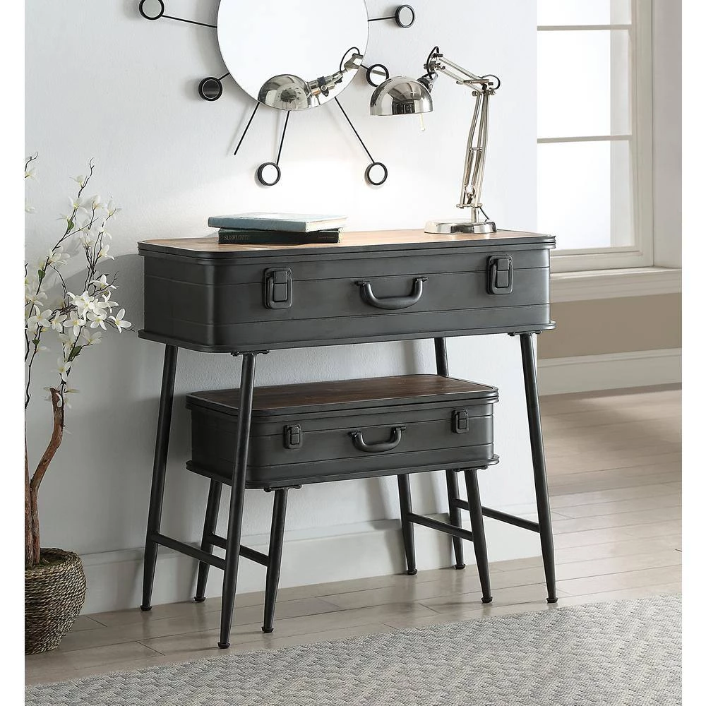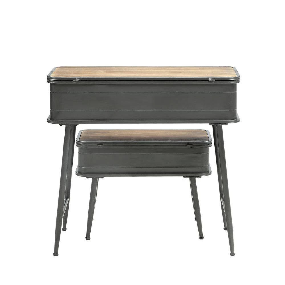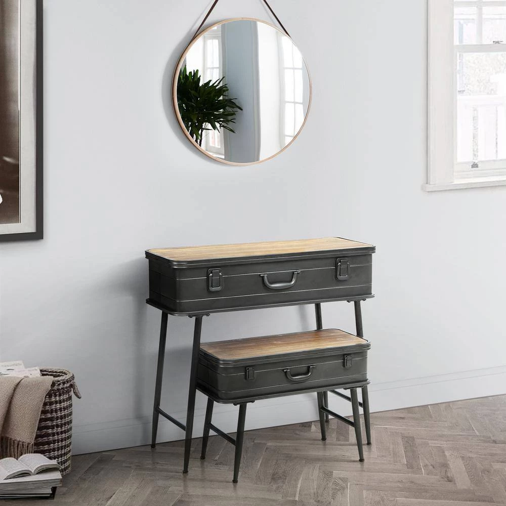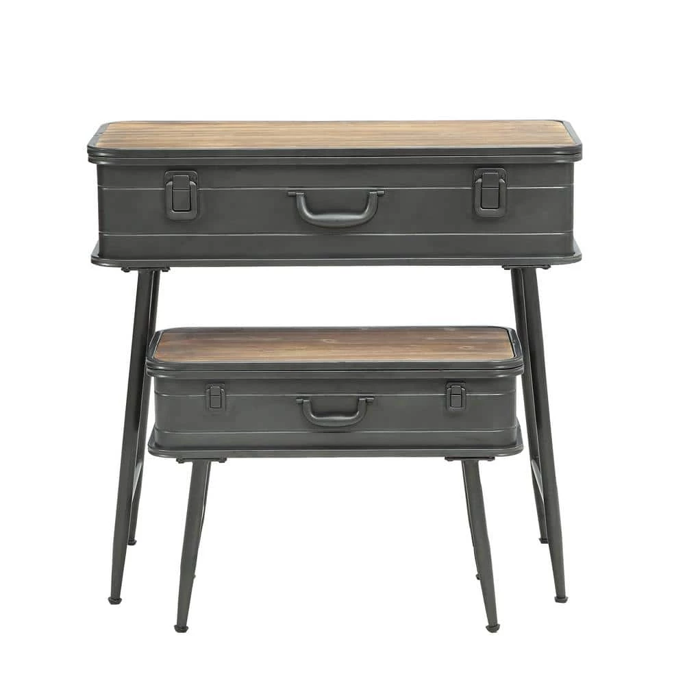 The uniquely designed Baldy Metal Trunk Tables are a perfect storage solution for almost any room in the home. This delightful piece is fashioned with such regal details as decorative pull handle and trunk styled hinges. Both trunk tables have a distressed pine top that open to a wide storage area that is great for storing blankets, pictures or whatever your needs may be. With a set of rustic metal sculpted legs and cross pieces gives this table that added designer look and makes this item exceptional. These trunk tables will give any home that added designer touch. Clean with a dry cloth.