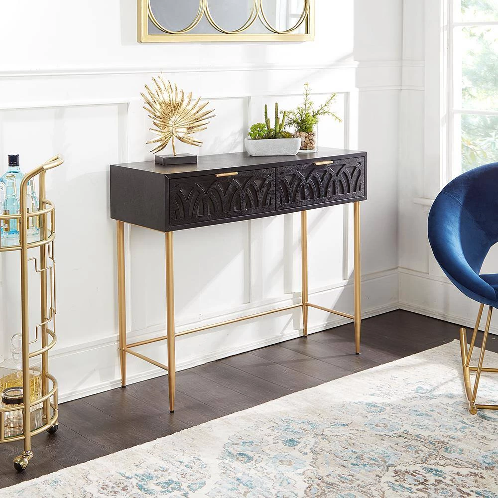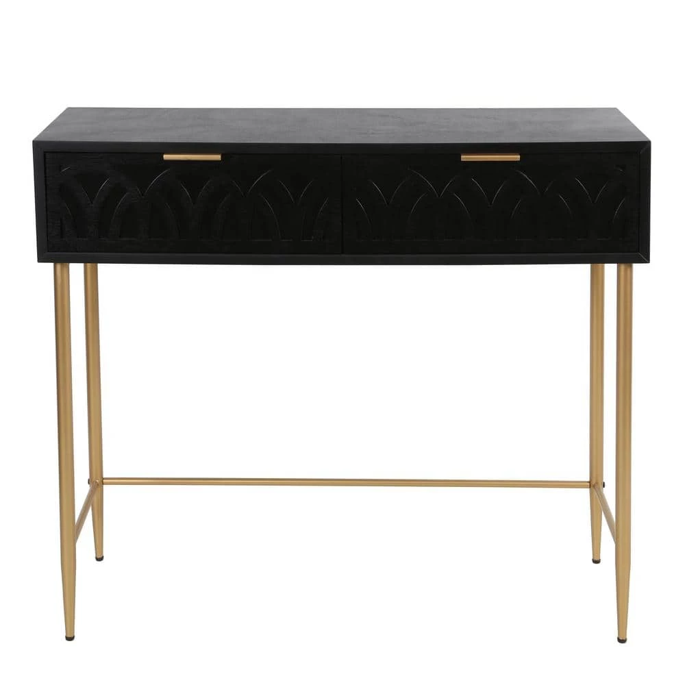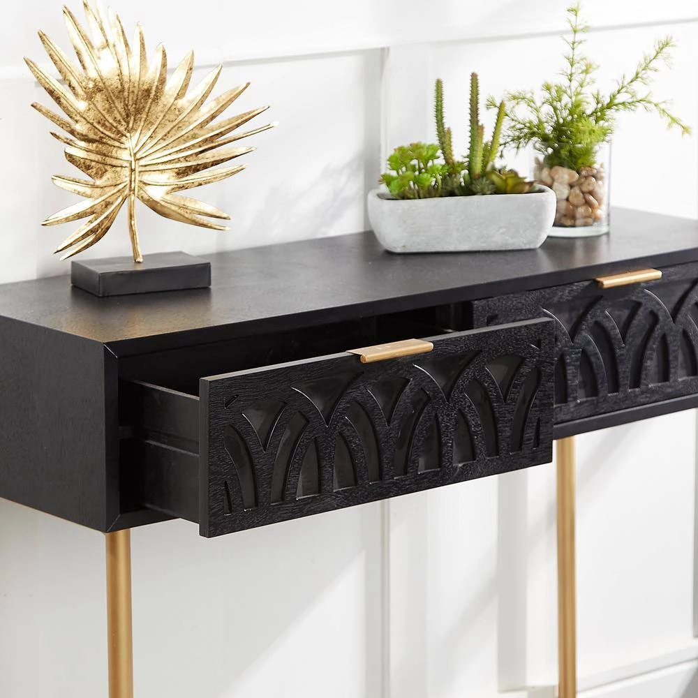 Dive into formal elegance with the Ballerine Two Drawer Console Table! Perfected in modern charm, this lovely accent table exudes trend and style like none other. The carved, arch-window featured drawers display the unique style of the Ballerine; while the gold painted legs make it pop with pizzazz. Store away your small personal items with ease as you get ready for your day or returning home. Place lovely blooms atop the surface and your look is complete. Constructed of MDF and metal and measures 31.5″H x 38″W x 13″D.