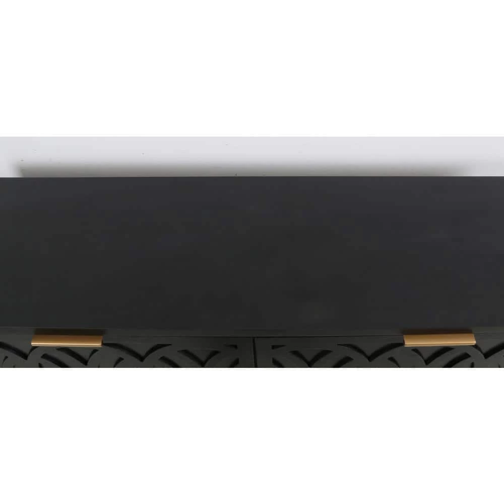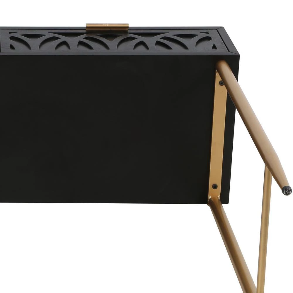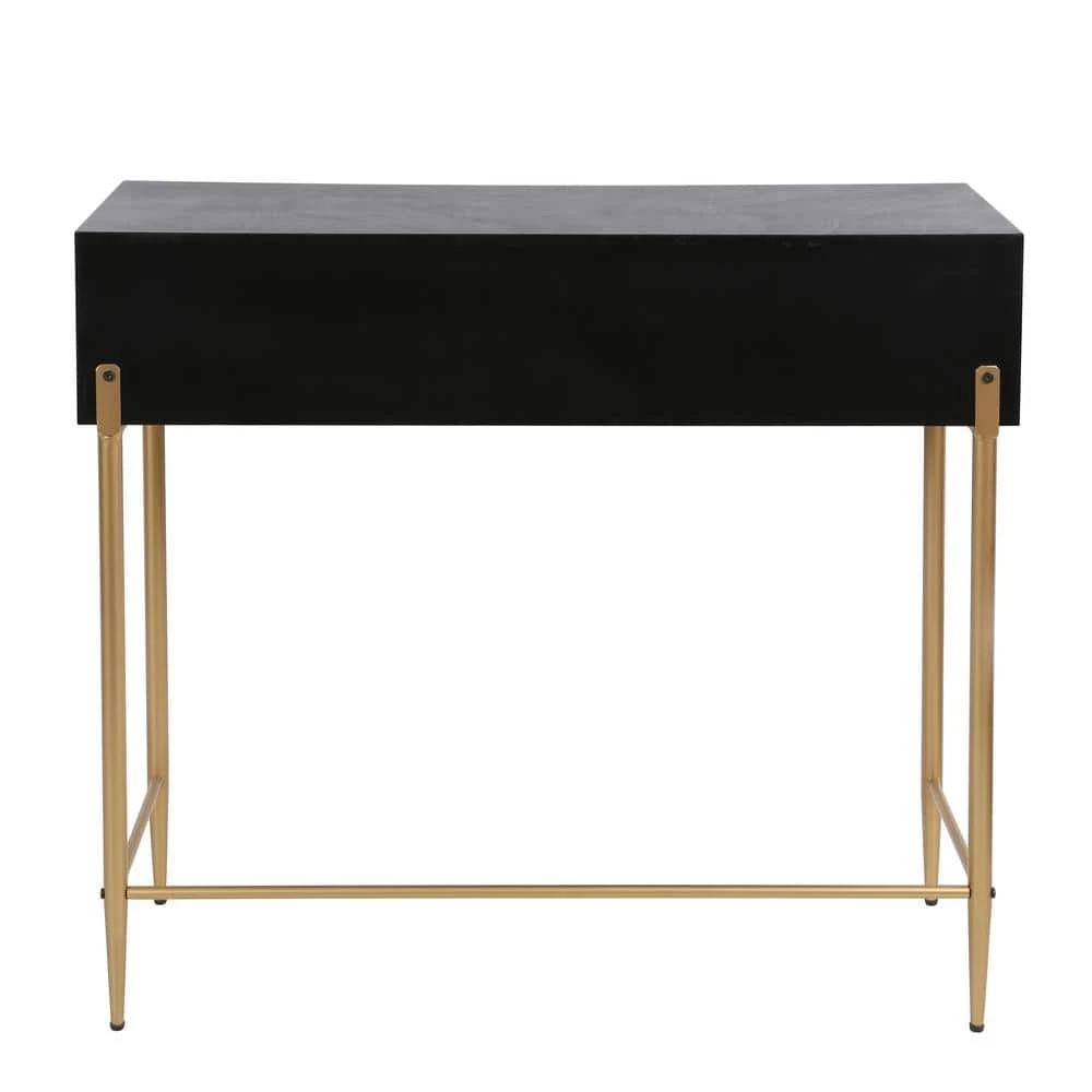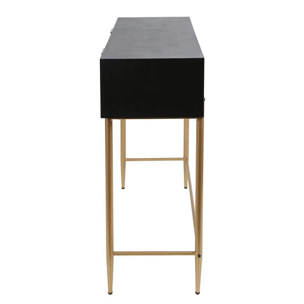 Dive into formal elegance with the Ballerine Two Drawer Console Table! Perfected in modern charm, this lovely accent table exudes trend and style like none other. The carved, arch-window featured drawers display the unique style of the Ballerine; while the gold painted legs make it pop with pizzazz. Store away your small personal items with ease as you get ready for your day or returning home. Place lovely blooms atop the surface and your look is complete. Constructed of MDF and metal and measures 31.5″H x 38″W x 13″D.
