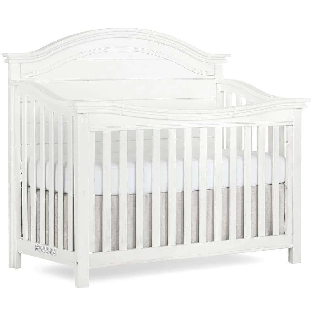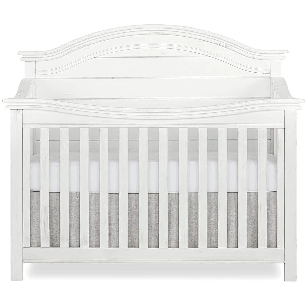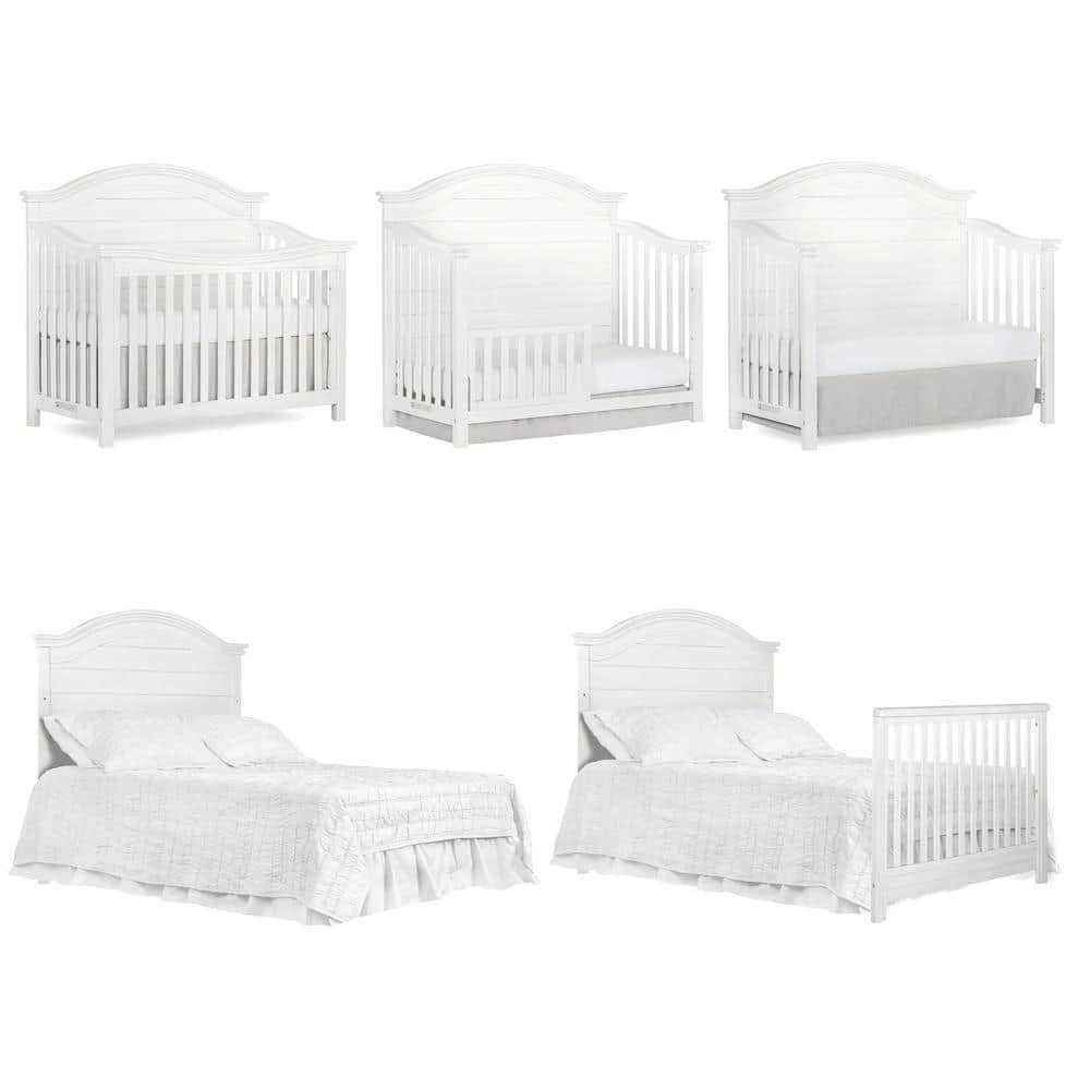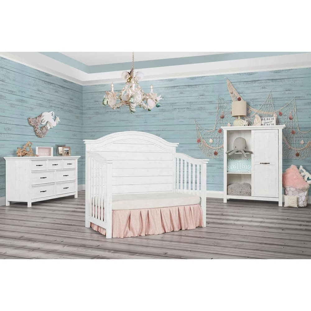 The Evolur Belmar Curve top crib was inspired by white Adirondack chairs on a white sandy beach overlooking the blue horizon on a lazy summer day. This crib adds rustic elements such as shiplap details with singular route lines which curves the headboard. The Belmar offers a simplistic design beyond the classic. It converts into a toddler bed, a daybed and a full-size bed to accommodate your growing child (conversion rails sold separately). Using quality materials and craftsmanship, along with forward-thinking functionality, this piece is designed to work effortlessly throughout the years. This collections will take you back to the days of walking barefoot on the beach, eating ice cream and watching the sunset with your family. Also included in this collection are a tall chest and a seven-drawer double dresser (both sold separately) that serves as a changing surface with the addition of a contour pad secured to the back. The drawers feature quality side-mounted ball bearing glides and metal drawer pulls. This collection will resonate to a mom’s coastal elegant sense.