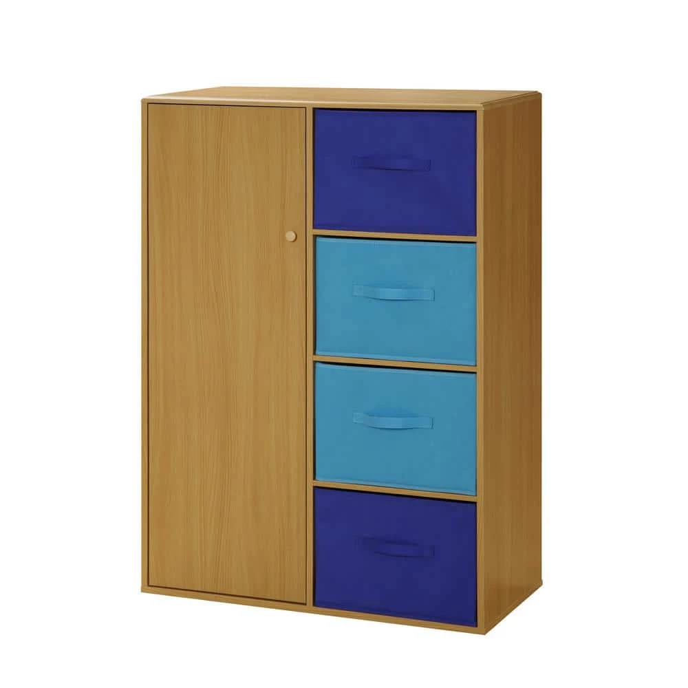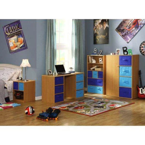 Designer beech storage armoire has Navy and light blue accents just right for your child’s bedroom. The top of unit is shaped and corners are eased so there are no sharp edges. The colorful ready-to-unfold canvas drawers are accented with handles attached on two sides of the drawers. These drawers are great for holding your games, controllers, clothes, toys or any of your storage needs. The drawers rest gently on the shelf and can be carried with the handles to take with you to any room in the house. Constructed of Composite Board and highly durable PVC laminate. Clean with a dry non abrasive cloth. Ready to Assemble with Cam and Dowel Construction.