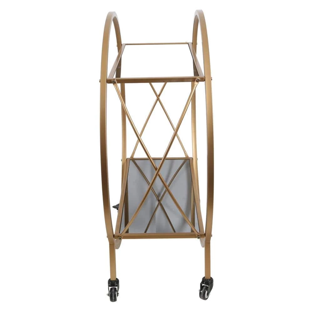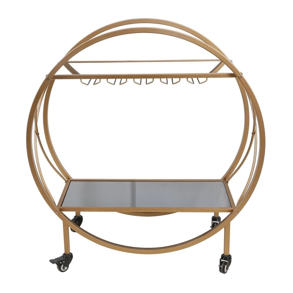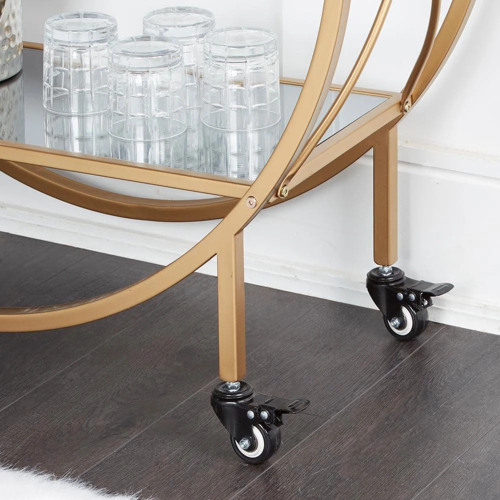 Sass’ and class is the style of the Evelyn Round Mirrored Two Shelf Bar Cart. Crafted in a round form housing two mirrored shelves, the Evelyn makes her statement among the more glam and modern decor styles. Perfect for dinner parties and late night gatherings, this lovely bar cart offers ample room for dining utensils, appetizers and treats. The two shelves are crafted in a mirrored glass and and solidified with a metal frame running down to the four wheels with casters for locking capabilities. The handy hooks beneath the top shelf can hold up to 12 wine glasses; making your hospitality efforts flourish when serving large parties. Your transition from the kitchen to your hosting location will be a breeze when the Evelyn has an opportunity to perform and shine. Constructed of metal and mirror and measures 36″W x 14″D x 38.75″H.