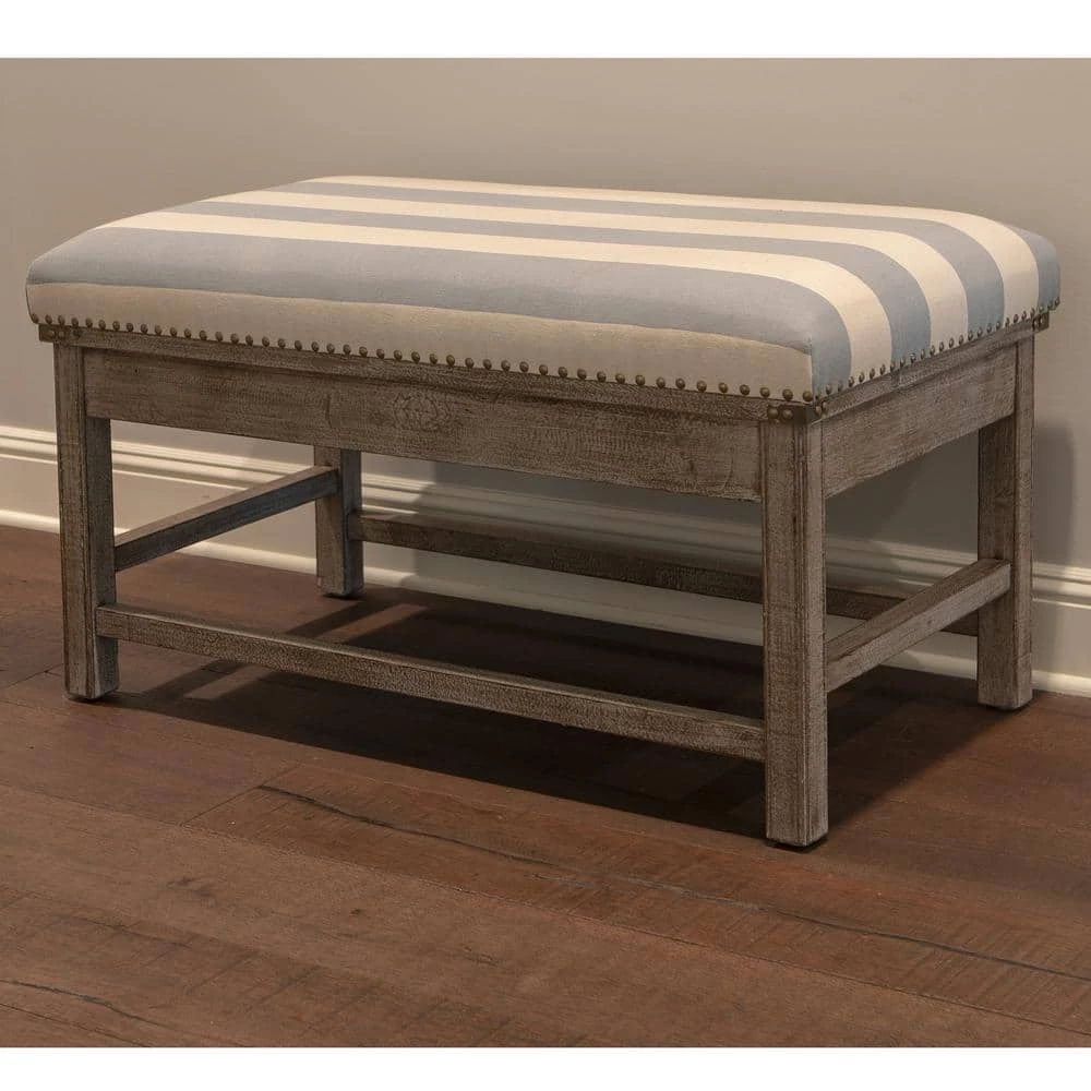 Rustic, yet refined, the Farley upholstered ottoman adds dimension and functionality to your home decor. A weathered barn wood finished frame is perfectly distressed for a touch of time-worn character that compliments the upholstered cushion, creating a striking transitional look. The comfortable foam cushion provides support while the nail head trim adds a polished finishing touch. Increase the value of your family room by topping this ottoman with a tray for added entertaining space, or keep it close to the couch and use it as a footstool. Ideal for adding multifunctional modern farmhouse appeal to your foyer or living room alike. Measures 35.43 in. x 20.08 in. x 19.69 in.
