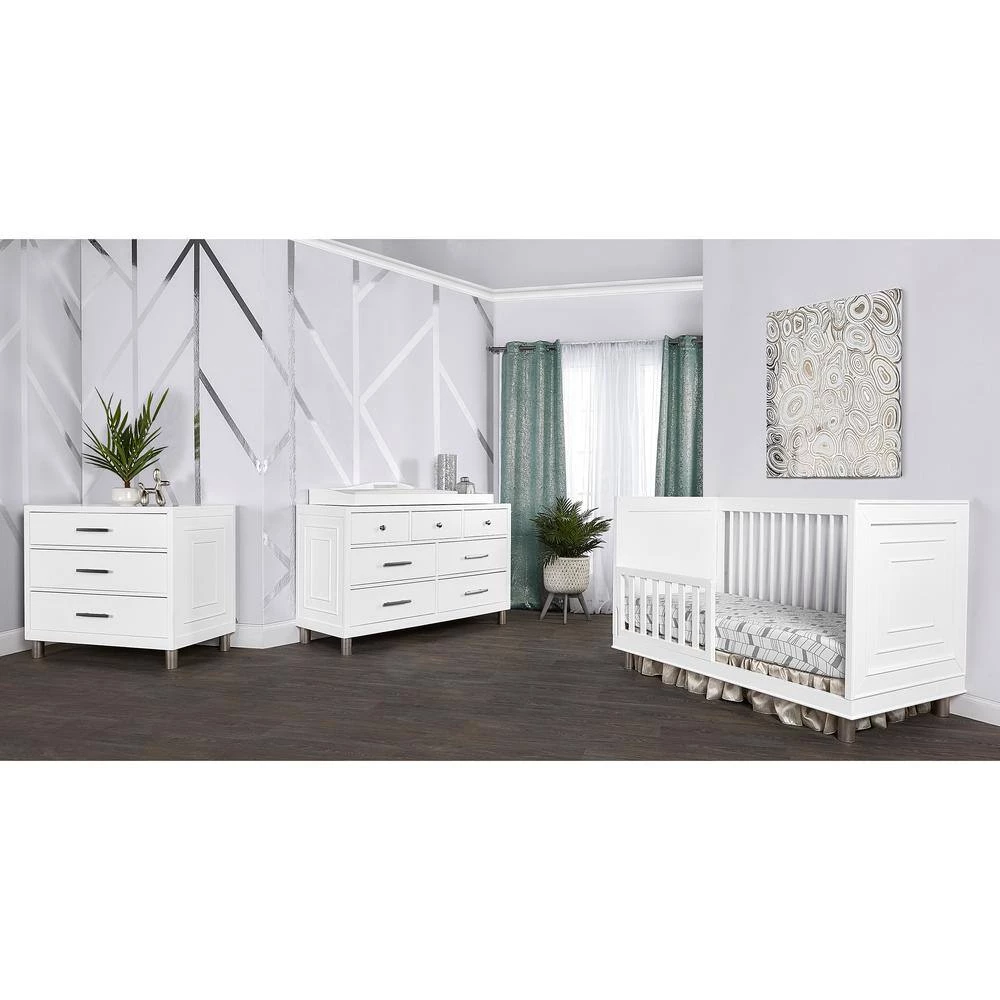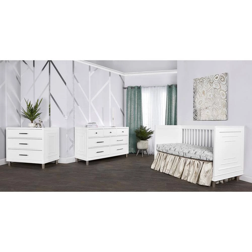 Evolur Loft introduces its Art Deco collection which is inspired by luxury and sophisticated modern living. The Art deco crib features rounded spindles on a solid frame, Antique silver feet with crafted end panel showcasing geometric art decor molding. This crib is designed to converts to a toddler bed and day bed to accommodate your growing child (conversion rails sold separately). Using quality materials and craftsmanship, along with forward-thinking functionality, this piece is designed to work effortlessly throughout the years with a modern feel and distinctively understated. This crib can be paired with a mixture of metal, bold geomatics elements and cozy palette of pinks, blues and neutrals to showcase how minimalism and glamour make the perfect combination. Evolur Loft Art Deco collection offers as an array of case goods including standard double dressers and tall chests. Also, available is a universal nightstand, change station tray, conversion kit and toddler rail (sold separately).