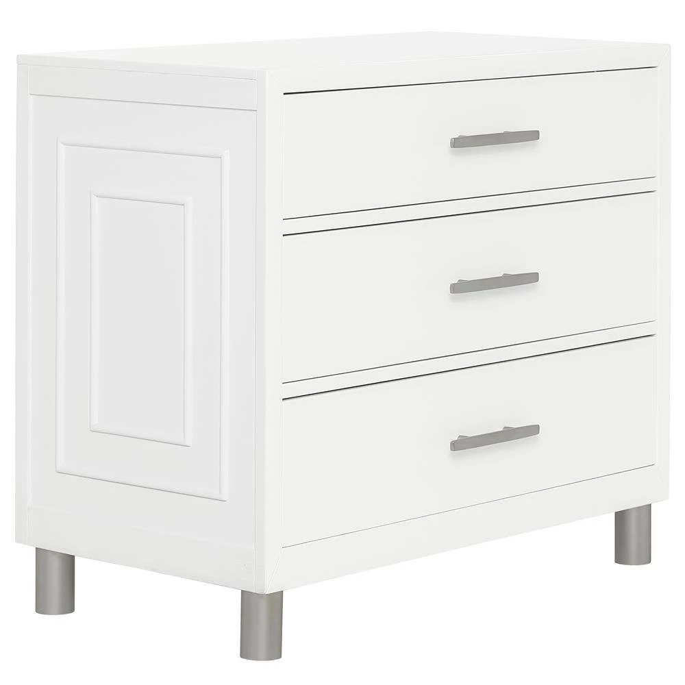 Evolur Loft introduces its Art Decor the collection which is inspired by luxury and sophisticated modern living. This chest feature Antique silver feet with crafted end panel showcasing geometric art deco molding. The art deco chest features 3-drawers with quality side mount glides and made with premium material, craftsmanship, and forward-thinking functionality. This chest can be paired with a mixture of metal, bold geomatics elements and a cozy palette of pinks, blues and neutrals to showcase how minimalism and glamour make the perfect combination.