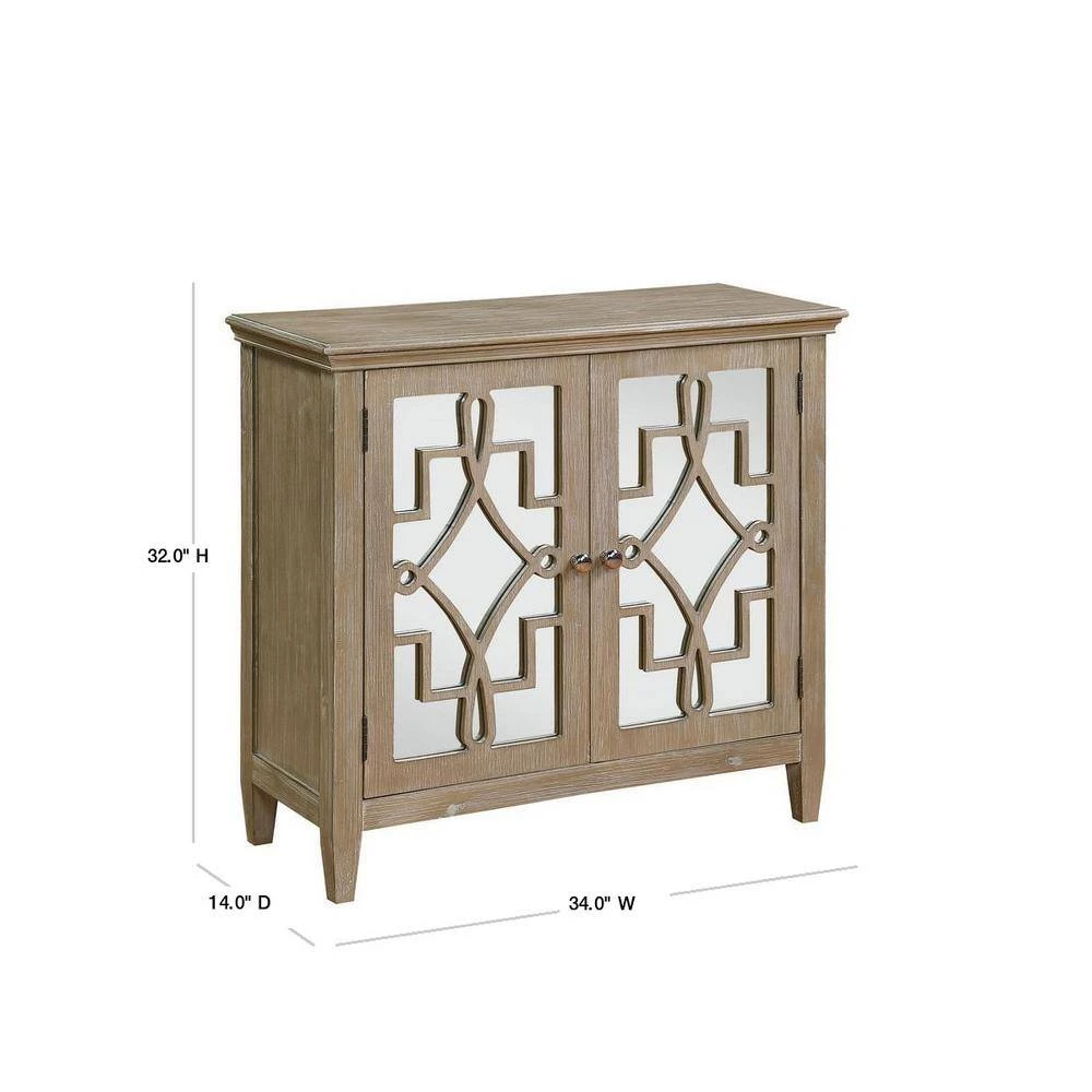 The Lucy Accent Chest is a charming way to add a little glamour into any space where is storage is needed. The geometric overlay on top of the two mirrored doors allows for the storage space to be hidden, while breaking up the monotonous design that can come from an all wood product. This item has a clean-lined silhouette starting with the flat top, offering a perfect space to display photographs, jewelry, etc., all the way down to the tapered legs, which also add height to the profile of the piece. The Lucy Accent Chest is sure to add a piece of old world charm in any space in your home or office. Clean with dry non-abrasive clothe. This unit comes ready to ship with step by step instructions and the necessary hardware.
