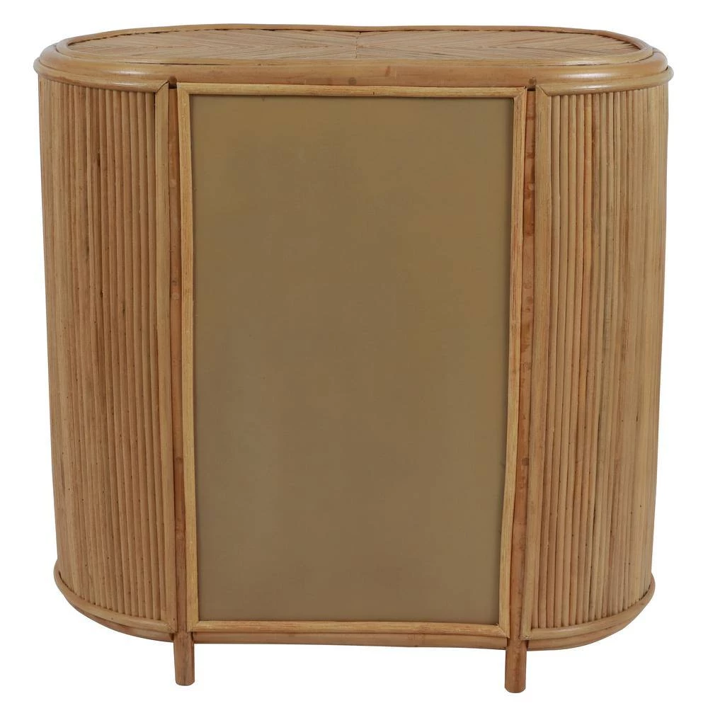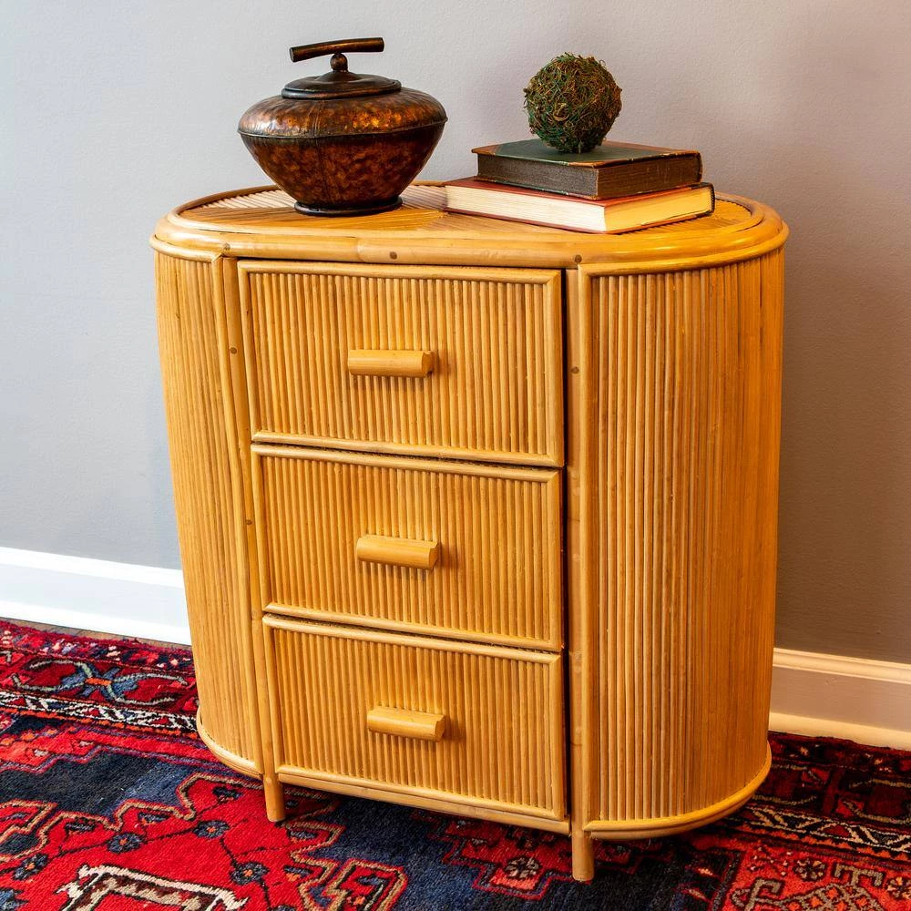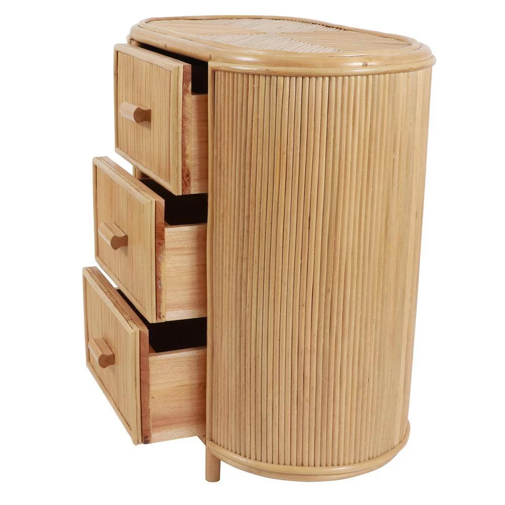 Farmhouse design meets practical storage in the attractive Lulu Rattan 3-Drawer Console Table. Natural mahogany wood makes a bold statement, while natural bamboo paneling creates a modern look and feel. The rounded edges of the table’s sides and surface area allow for flexibility and fit in unique spaces, as well as safety from sharp corners in a tight walkway. Each of the side table’s 3-large drawers features a single pull for easy access.