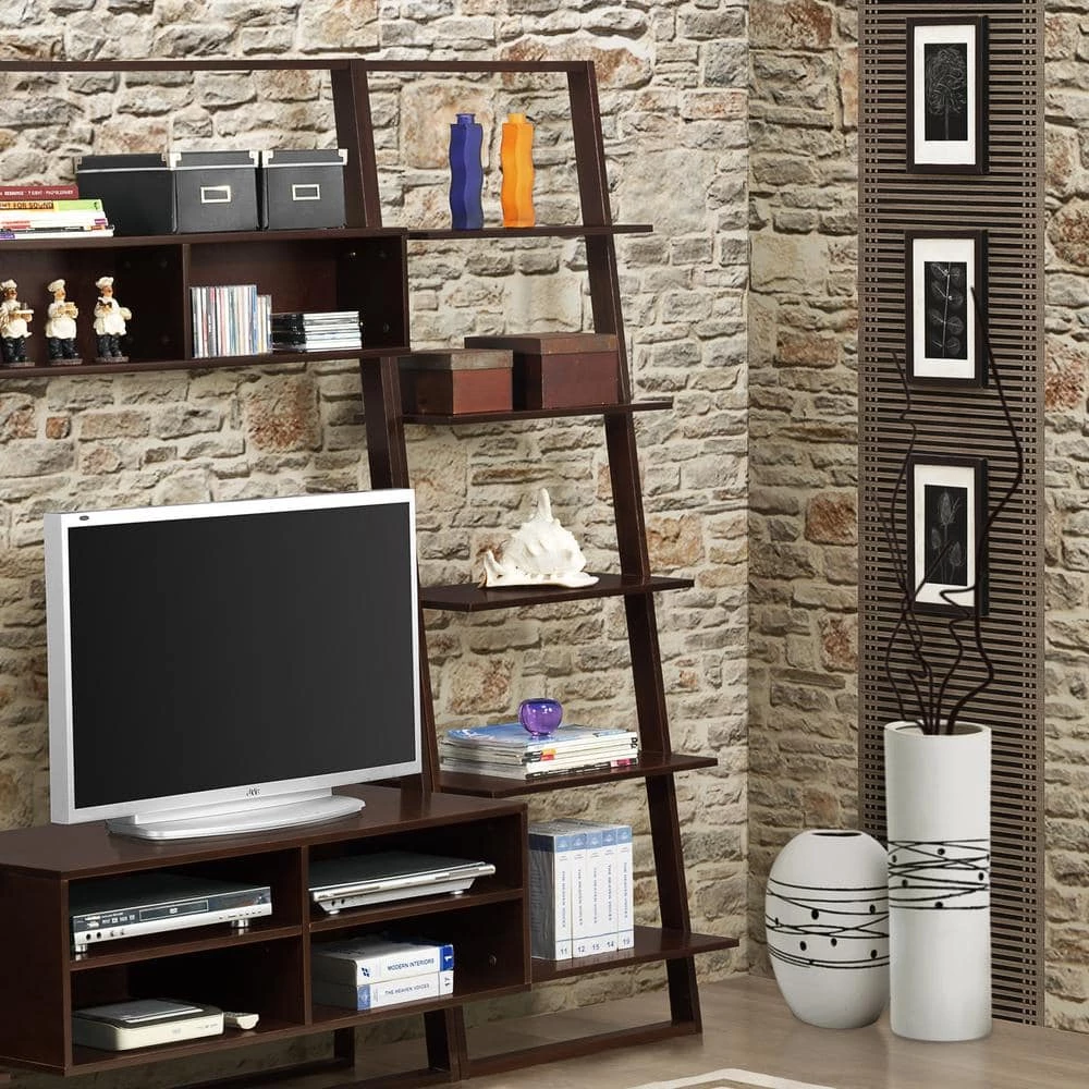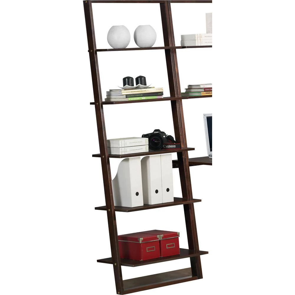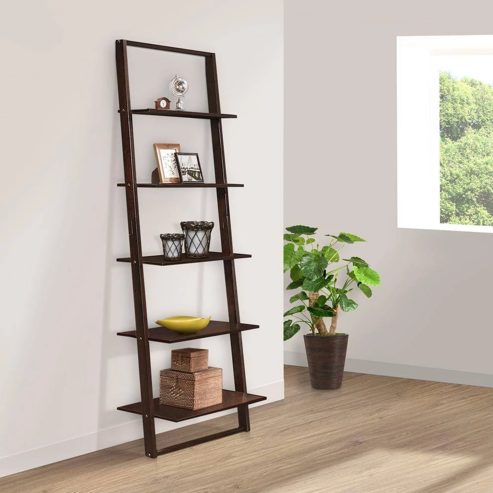 The Lytle Creek Ladder Bookcase is a uniquely designed and pleasing aesthetic to make any room a perfect choice for this bookcase. This bookcase has ample room to display pictures, decorative pieces and even books. This richly finished cappuccino colored bookcase will showcase well in any room in the home! Comes ready to assemble. Clean with a dry cloth.