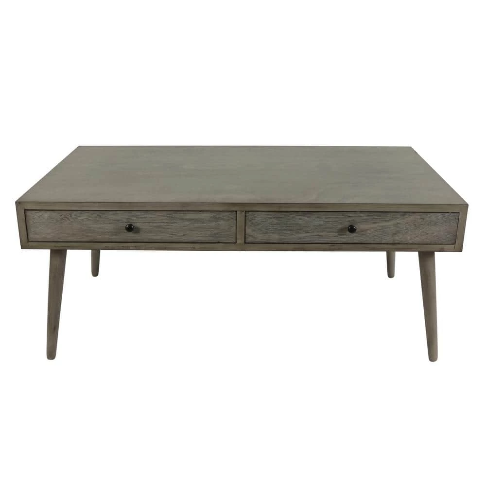 If you are looking for an affordable way to modernize your home with mid-century flair, look no further, this three-drawer console table will fill the bill, This uniquely designed two drawer coffee table encompasses mid-century modern design by exuding clean lines, a stylish finish and simple round hardware. Features include hardwood solids and veneer construction, two storage drawers and tapered legs. The ideal cocktail table to provide transitional modern styling and functionality to your living room or family room. Size: 41.75 in. W x 23.5 in. D x 17 in. H Manufactured in China. Ships Small Parcel. Assembly Required.