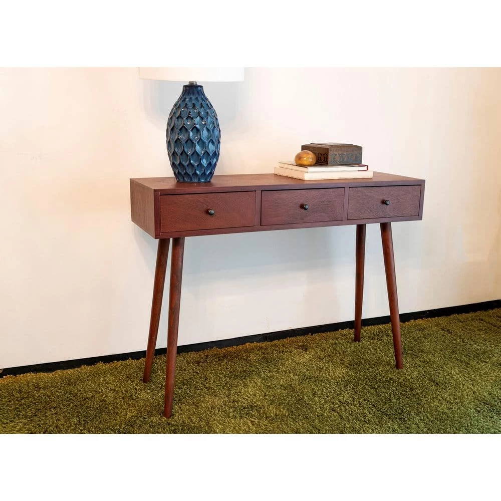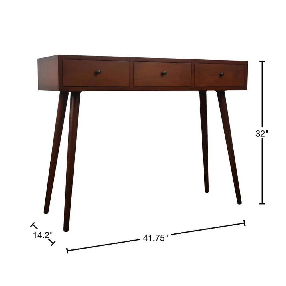 If you are looking for an affordable way to modernize your home with mid-century flair, look no further, this 3-drawer console table will fill the bill. This uniquely designed 3-drawer console table encompasses mid-century modern design by exuding clean lines, a lucid light walnut finish, and black drawer hardware. Features include hardwood solids and veneer construction, three storage drawers, and tapered legs. This product is extremely versatile and can be utilized as an accent piece, console table, or sofa table. Size: 41.75 in. W x 14.2 in. D x 32 in. H Manufactured in China. Ships Small Parcel.