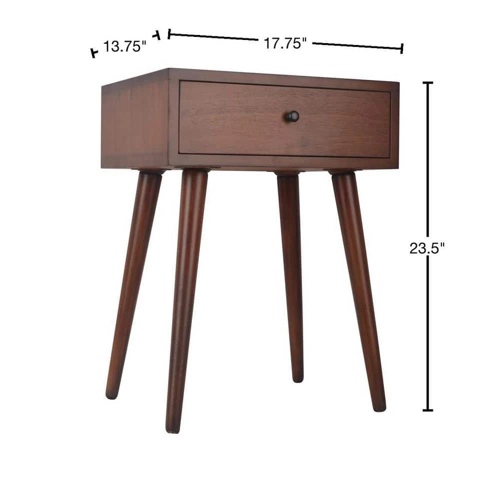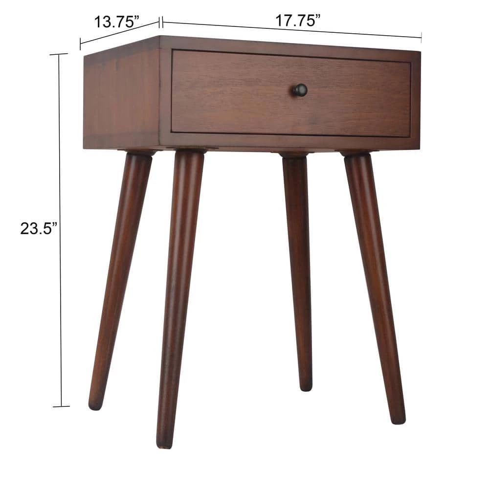 If you are looking for an affordable way to modernize your home with mid-century flair, look no further, this side table will fit the bill! This uniquely designed accent table encompasses art deco design by exuding clean lines, a Walnut finish, and black drawer hardware. Features include hardwood solids and veneer construction, one storage drawer, and tapered legs. This product is extremely versatile and can be utilized as a side table or accent table.