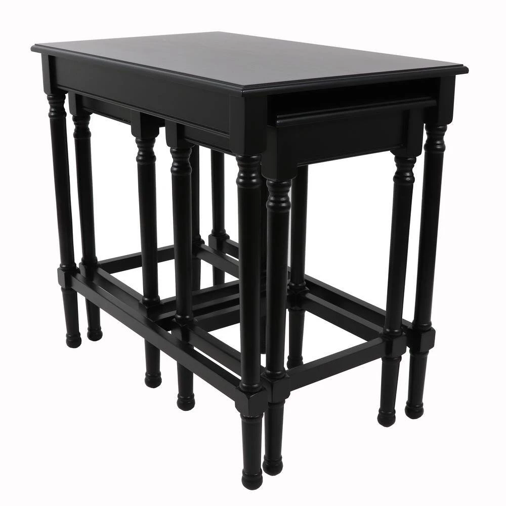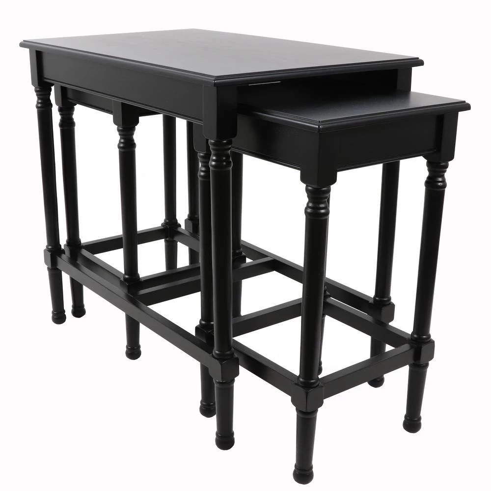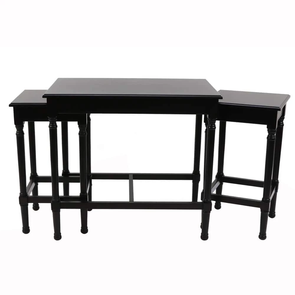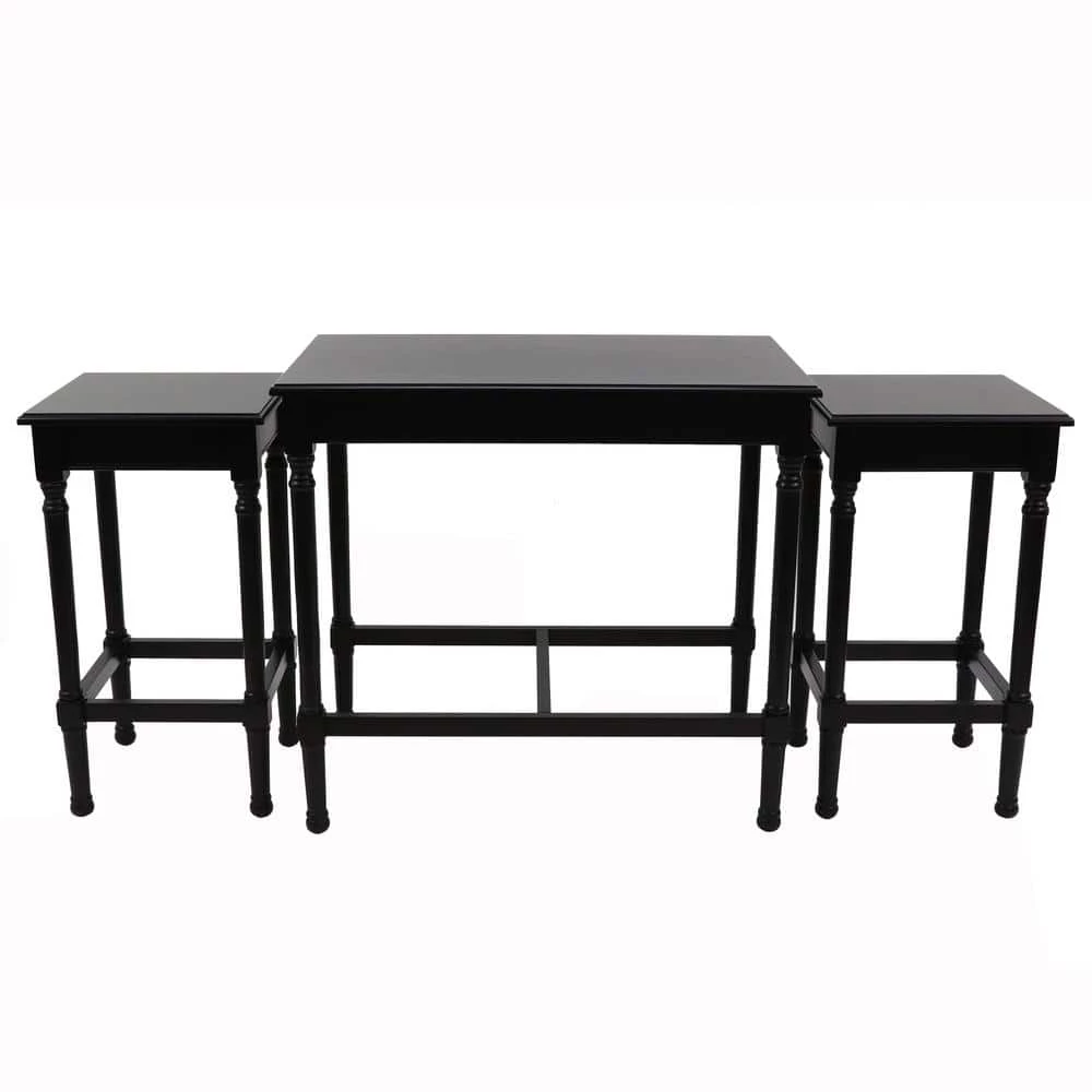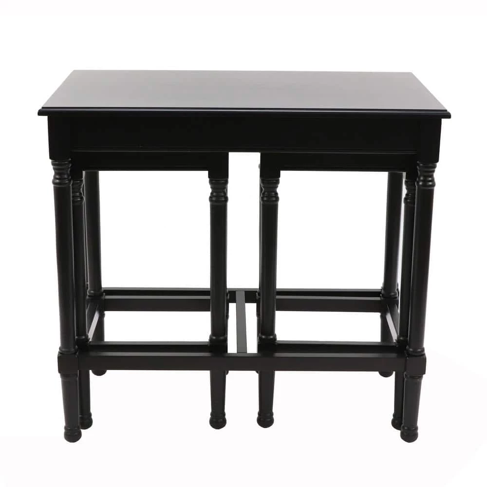Old-world charm meets contemporary styling in this rustic set of three nesting tables. Each table is crafted in wood with a darkened, aged finish at corners and crevices and long legs noted for their detailed beveled joints. The smaller tables offer square tabletops and nest neatly under the rectangular tabletop of the larger table. Wooden bars jointed along lower legs add reinforcement and stability to each table’s frame.