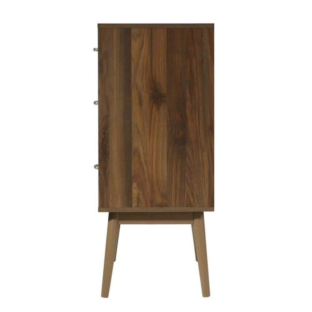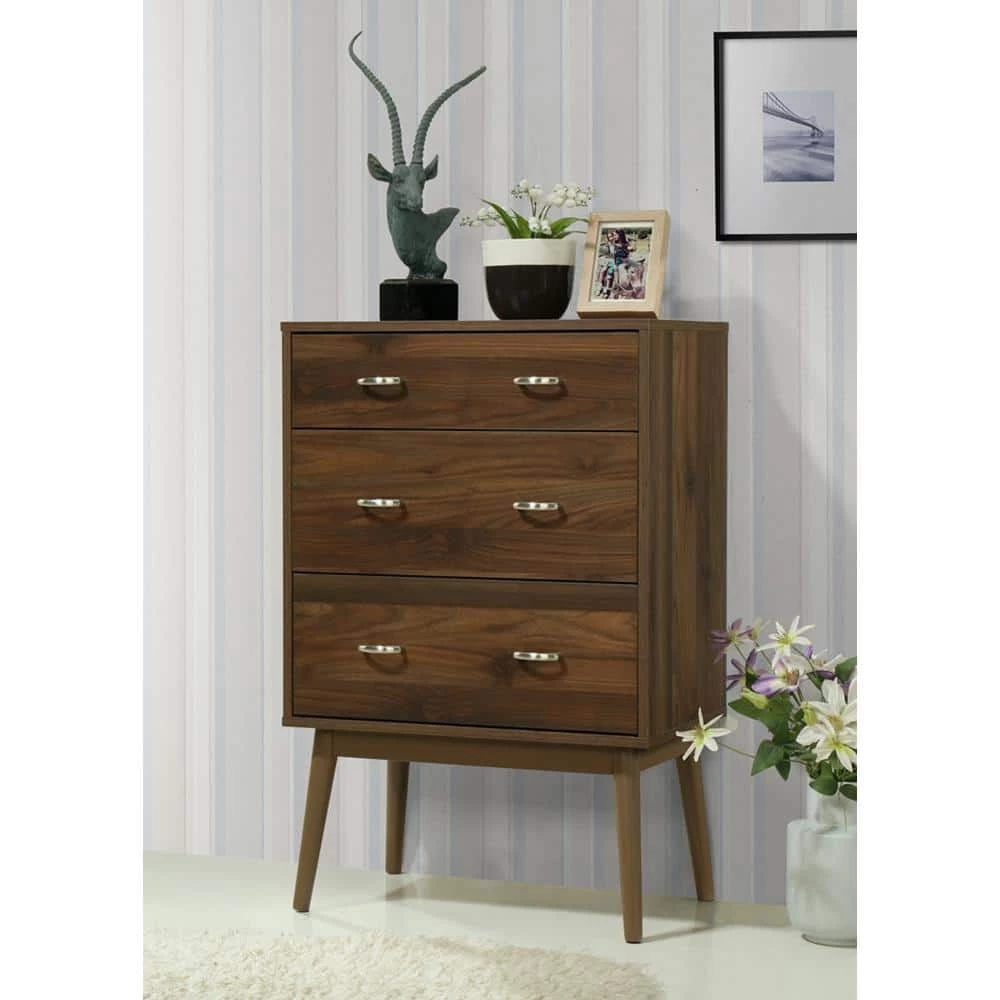 Montage 3-Drawer Mid-Century Dresser. This stylish 3-drawer dresser is an excellent addition for every home and will give your bedroom that added elegance. This finely crafted product combines glamour, comfort, at affordable prices. The dresser comes with metal slides on all drawers and is finished with a durable walnut laminate. The uniquely designed tapered legs are made of solid wood. Clean with a dry non abrasive cloth. Comes ready to assemble with the necessary hardware and step-by-step instructions.
