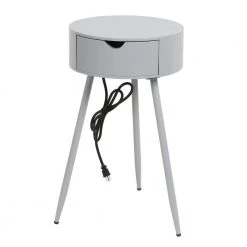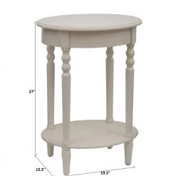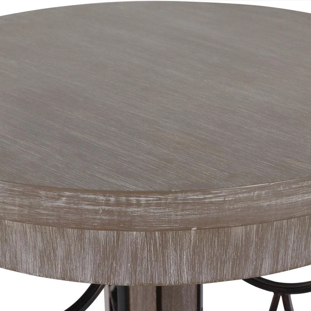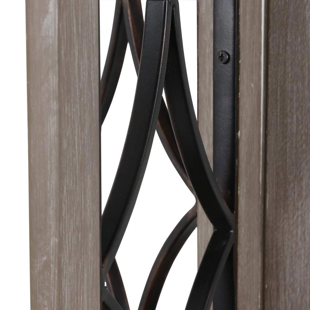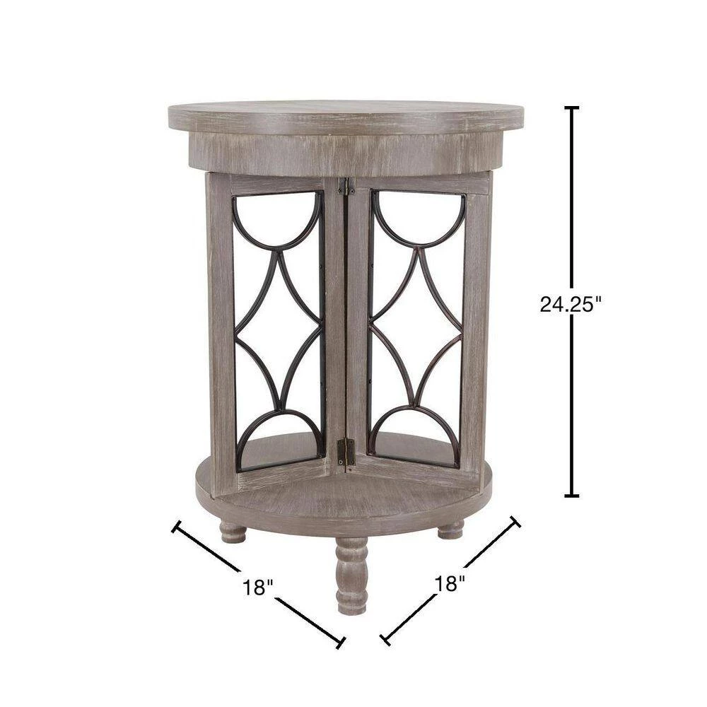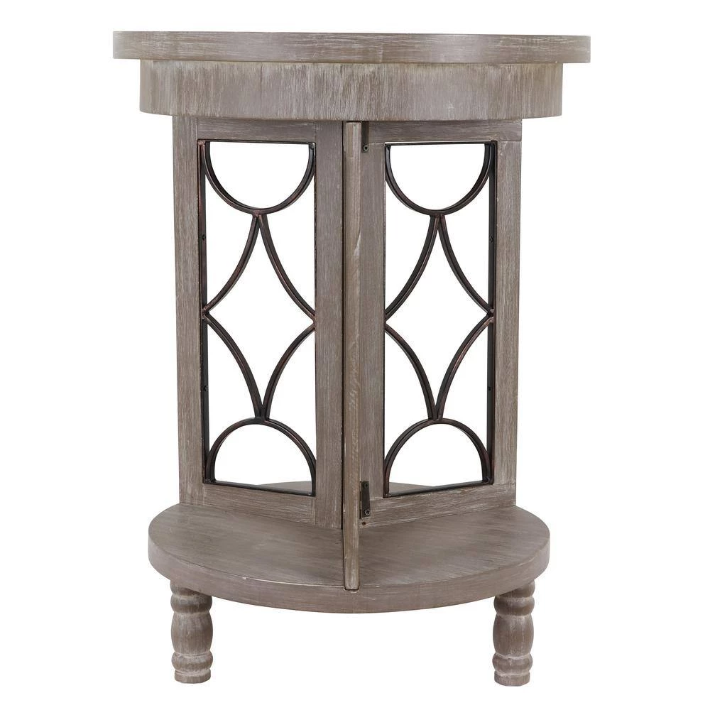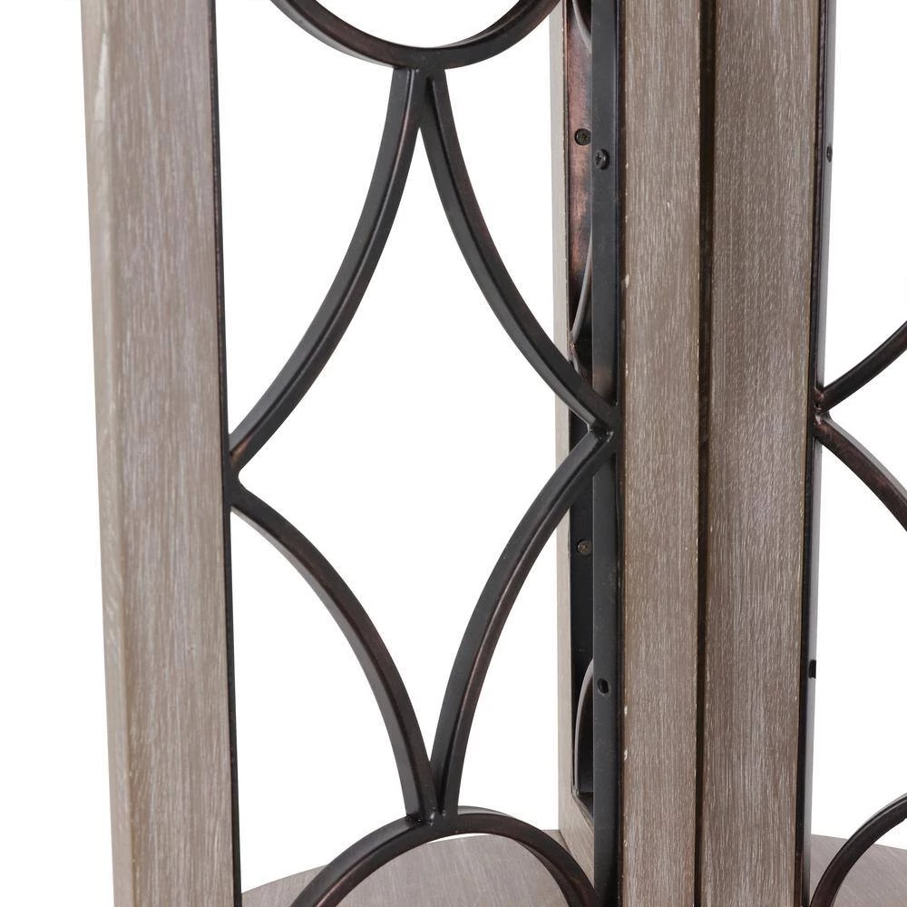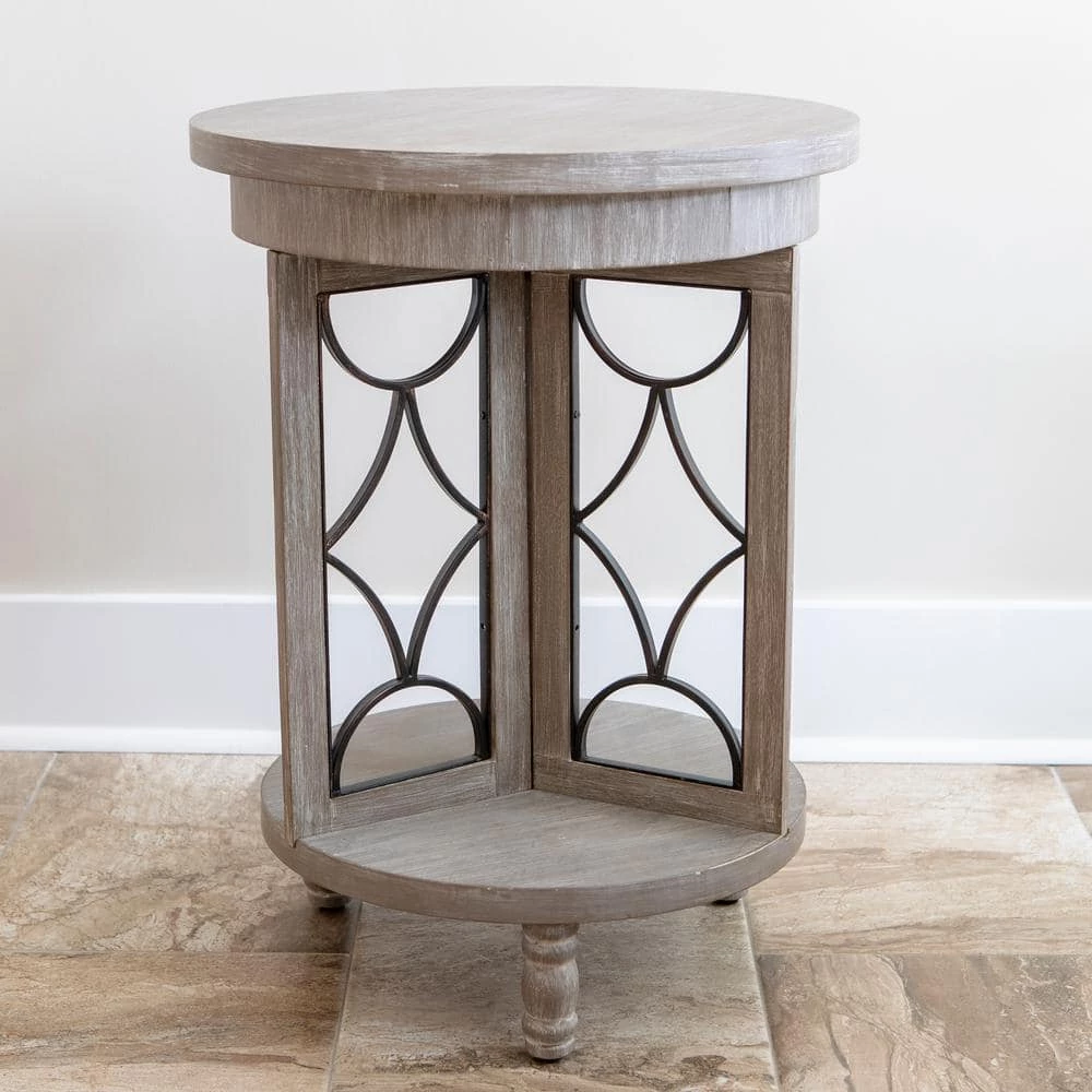 Textures of wood and metal collide in this charming transitional side table, the Roberta. Two round tabletops are adjoined by three rectangular wooden frames, each filled with decorate metal in an open large diamond and crescent pattern. The three frames create a divided lower shelf, ideal for a tall vase or decoration. Three stout legs serve as the table’s base, which is finished in a soft, ashy hue.