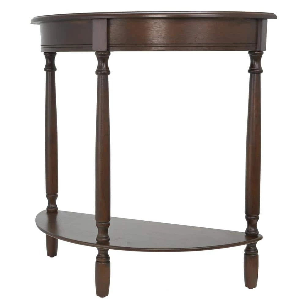 The traditionally designed Half Round Console Table is a multipurpose accent table. Imagine it greeting guests in the entryway, dressing a blank living room wall or even providing storage in a home office. A lower shelf doubles your storage capability. An elegant finish creates a stately look while the solids and MDF construction creates long lasting durability–combined this is timeless, functional console table. Easy to assemble. Table measures 28.25 in. x 11.8 in. x 28.25 in. Available in Walnut, antique white, eased edge black, antique teal, and eased edge, gray.