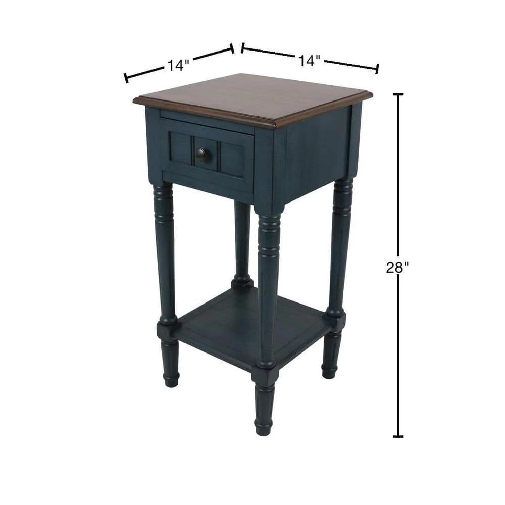 The quintessential side table, the Simplify One Drawer Accent Table is a delightful blend of timeless design and functionality. Classic turned legs and traditional details create the feel of a family heirloom, as if this table has been a part of your family for years. The traditional details are complimented by the clean, modern lines creating a transitional look that harmoniously blends into almost any style of decor. A single storage drawer allows you to keep clutter out of sight, but easily accessible. The lower shelf is ideal for displaying a basket, books or photos. Available in a variety of finishes, ensuring you can find a side table that best suits your needs. The opportunities to put this multipurpose accent table to use are endless. Place one in the entryway to catch keys and greet guests or next to the sofa topped with a lamp and vase of cheerful blooms. The Simplify accent table is compact and measures 14 in. x 14 in. x 28 in., making it ideal for small spaces as well as larger ones. Constructed of wood solids and MDF. Some assembly required.