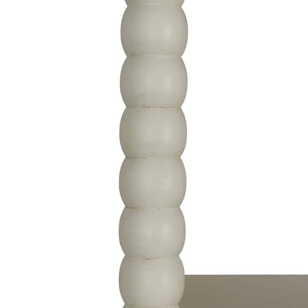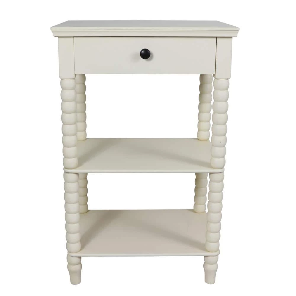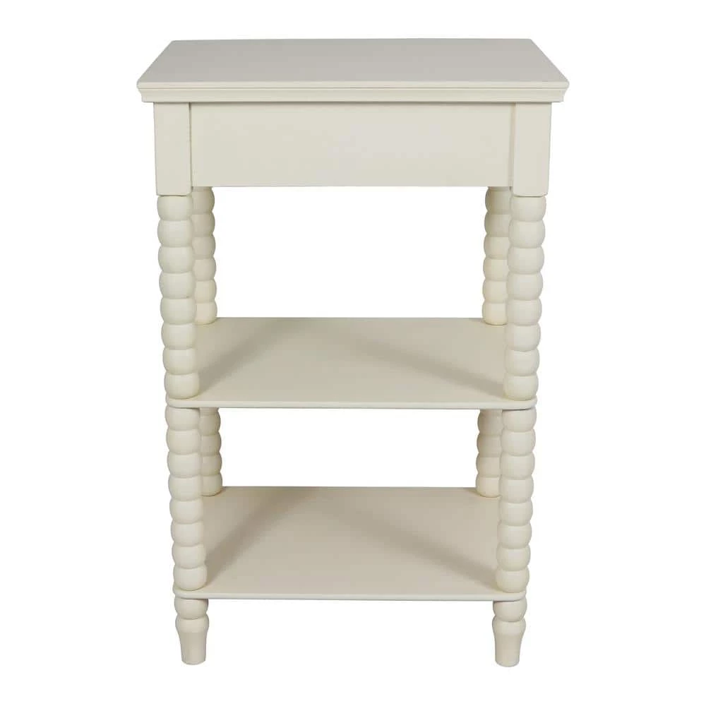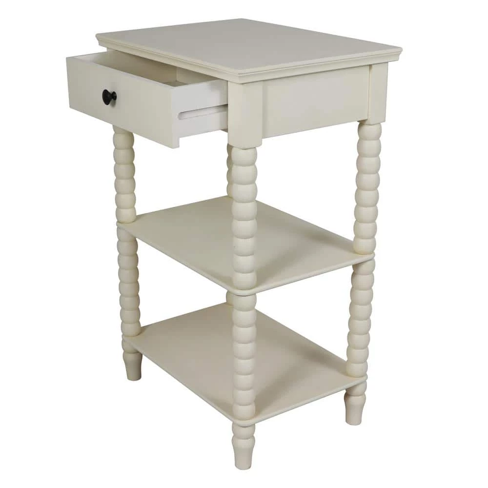 Create a living space that is full of charm, functionality and timeless sophistication with the Spindle Side Table. Traditional details and clean modern lines create a transitional look that is capable of pulling a room together while providing ample storage. The traditional spool-turned legs of the Spindle Side Table are reminiscent of 19th century furniture, adding an element of classic elegance and thus enhancing the design of this transitional side table. A single storage drawer allows you to house your belongings out of sight while keeping them easily accessible. The two lower shelves double your storage capabilities, allowing you to display books, baskets or home accents. Top this multipurpose accent table with a lamp and place it next to the sofa. Constructed of wood solids, MDF and wood veneers. Measures 19 in. x 14 in. x 17.8 in.