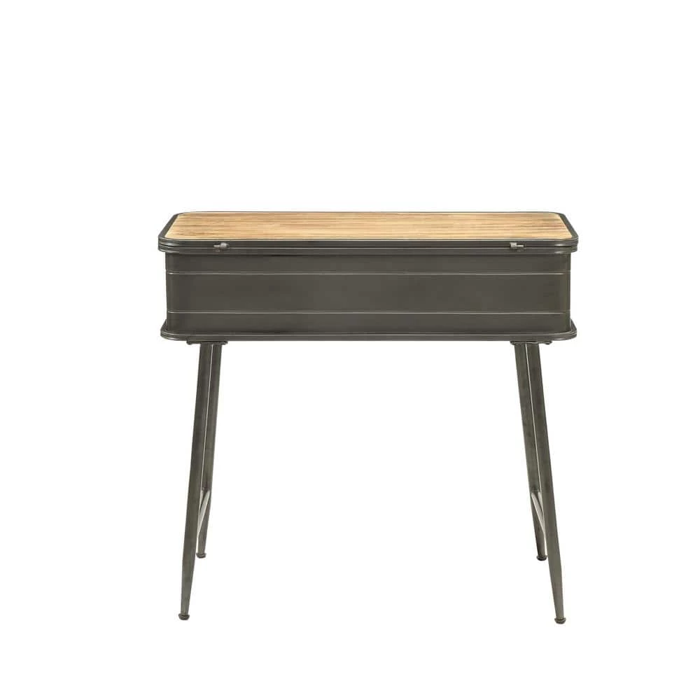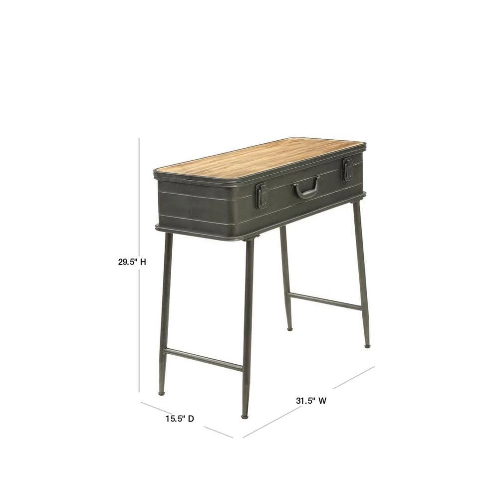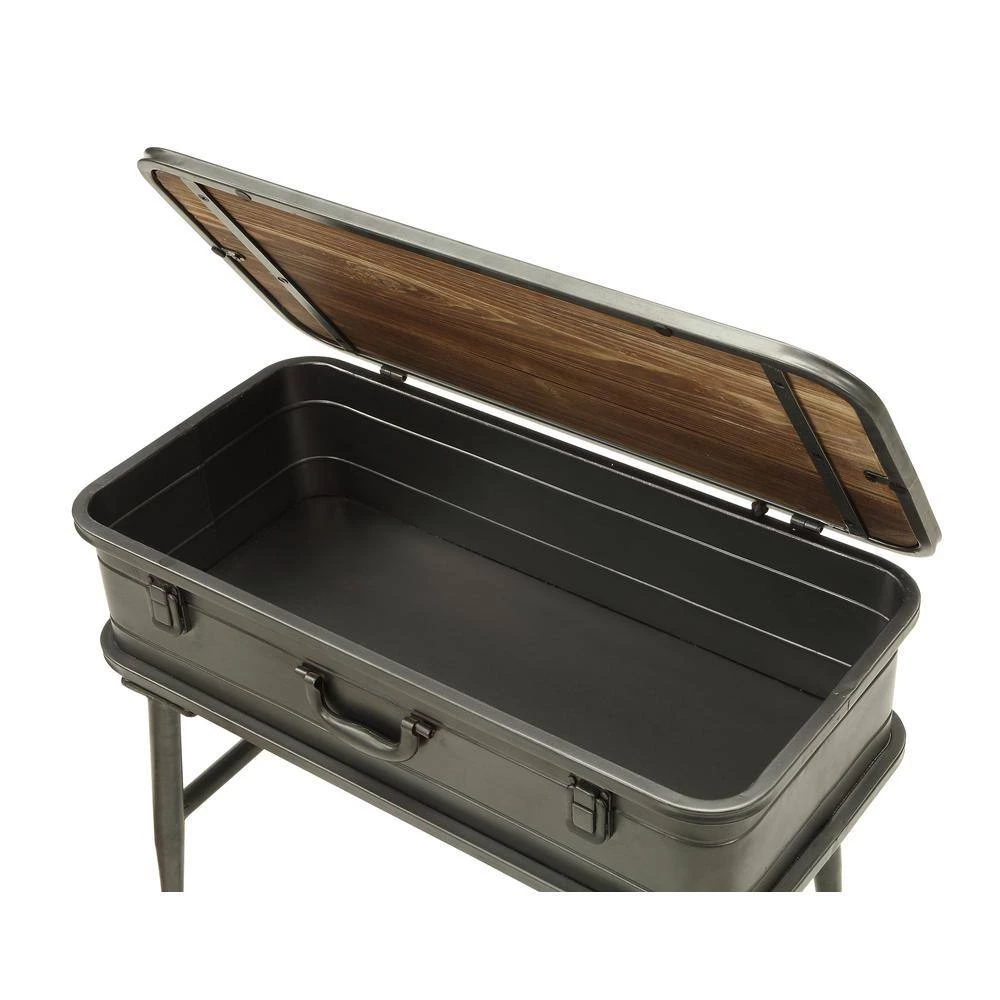 The uniquely designed 2 piece trunk tables are perfect storage solution for almost any room in the home. This delightful piece is fashioned with such regal details as decorative pull handle and trunk styled hinges. Both trunk tables have a distressed natural pine top that open to a wide storage area that is great for storing blankets, pictures or whatever your needs may be. With a rustic metal sculpted legs and cross pieces gives this table that added designer look and makes this item exceptional. These trunk tables will give any home that added designer touch. Clean with a dry cloth.
