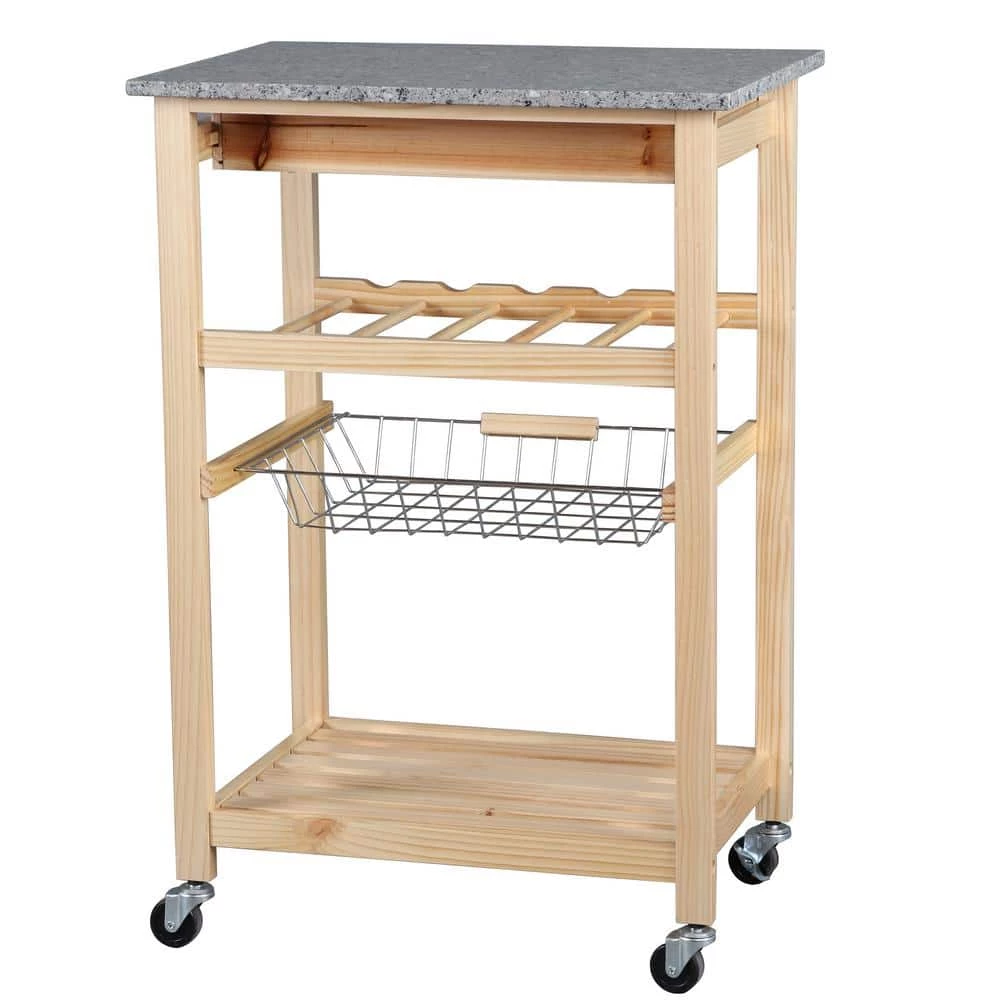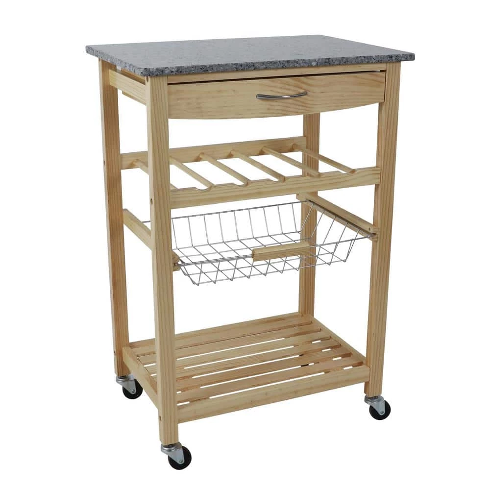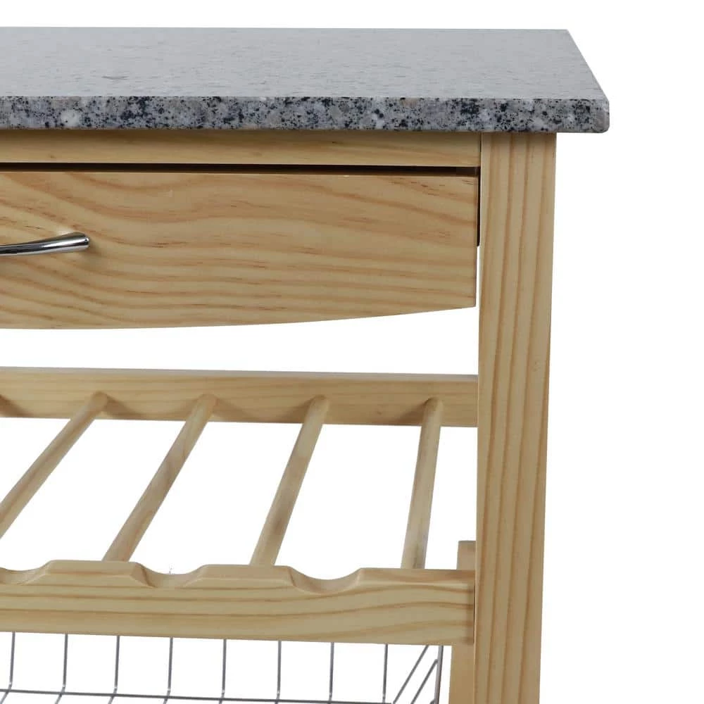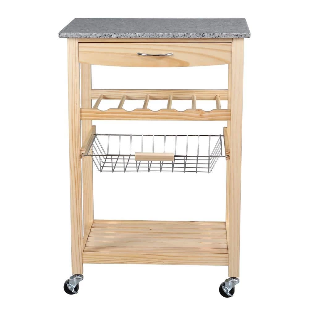 Design and functionality meet in harmony with the Vernon kitchen cart. This rectangular serving station can bring style and functionality to a small kitchen, dining room or pantry. The simple, clean lines lend a modern feel while the natural wood finish adds rustic character, creating a transitional look. The food safe top is perfect for prep, serving or storage use. Keep your kitchen organized by taking advantage of the ample drawer space. A metal wire pull out drawer provides quick access to your most frequently used items, whether it is cooking supplies or fruits and veggies. A built in wine rack and lower slatted shelf maximizes your storage capabilities, providing room for beverages, dining ware or displaying cookbooks. Four casters make transporting this cart a breeze, allowing you the option of pushing it against a wall while not in use. The sturdy Vernon kitchen cart is crafted of solid pine wood. Measures 22.83 in. W x 15.75 in. D x 33.86 in. H.