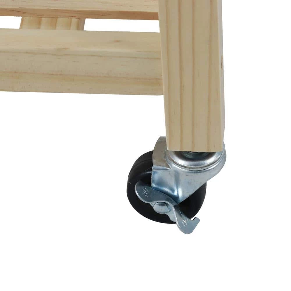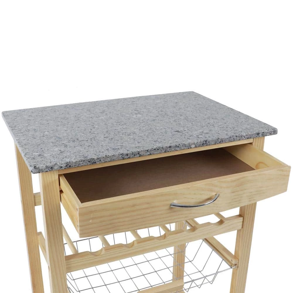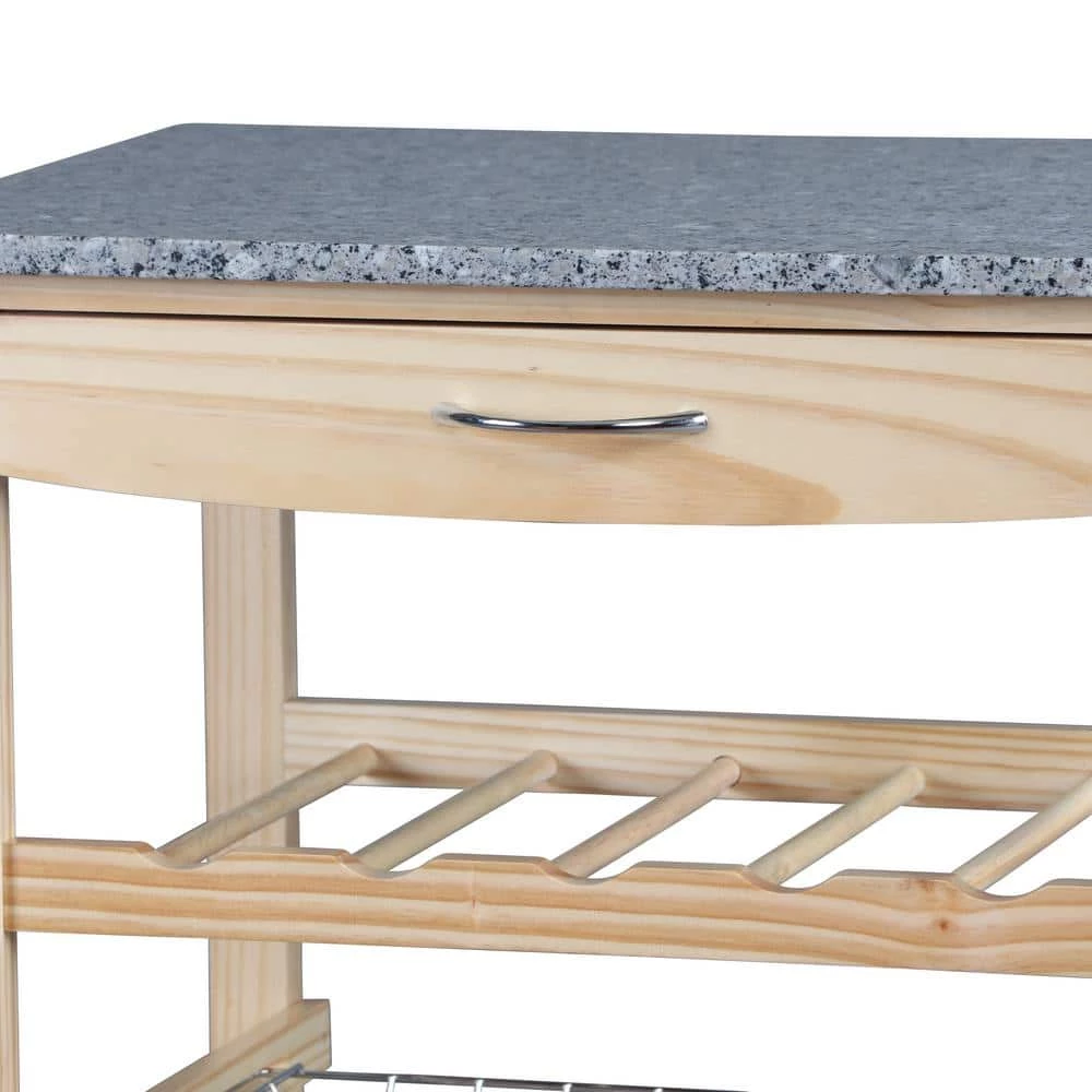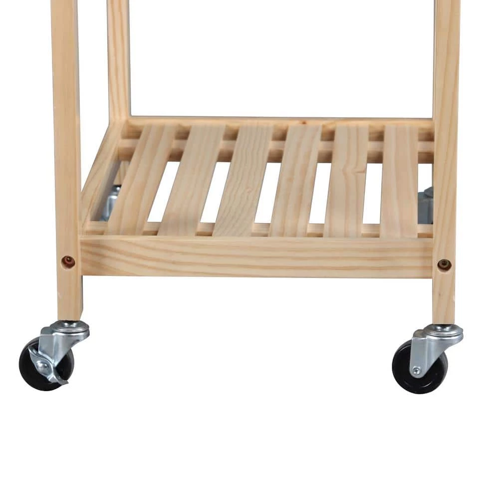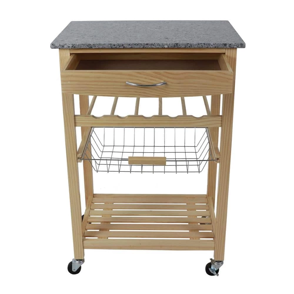 Design and functionality meet in harmony with the Vernon kitchen cart. This rectangular serving station can bring style and functionality to a small kitchen, dining room or pantry. The simple, clean lines lend a modern feel while the natural wood finish adds rustic character, creating a transitional look. The food safe top is perfect for prep, serving or storage use. Keep your kitchen organized by taking advantage of the ample drawer space. A metal wire pull out drawer provides quick access to your most frequently used items, whether it is cooking supplies or fruits and veggies. A built in wine rack and lower slatted shelf maximizes your storage capabilities, providing room for beverages, dining ware or displaying cookbooks. Four casters make transporting this cart a breeze, allowing you the option of pushing it against a wall while not in use. The sturdy Vernon kitchen cart is crafted of solid pine wood. Measures 22.83 in. W x 15.75 in. D x 33.86 in. H.