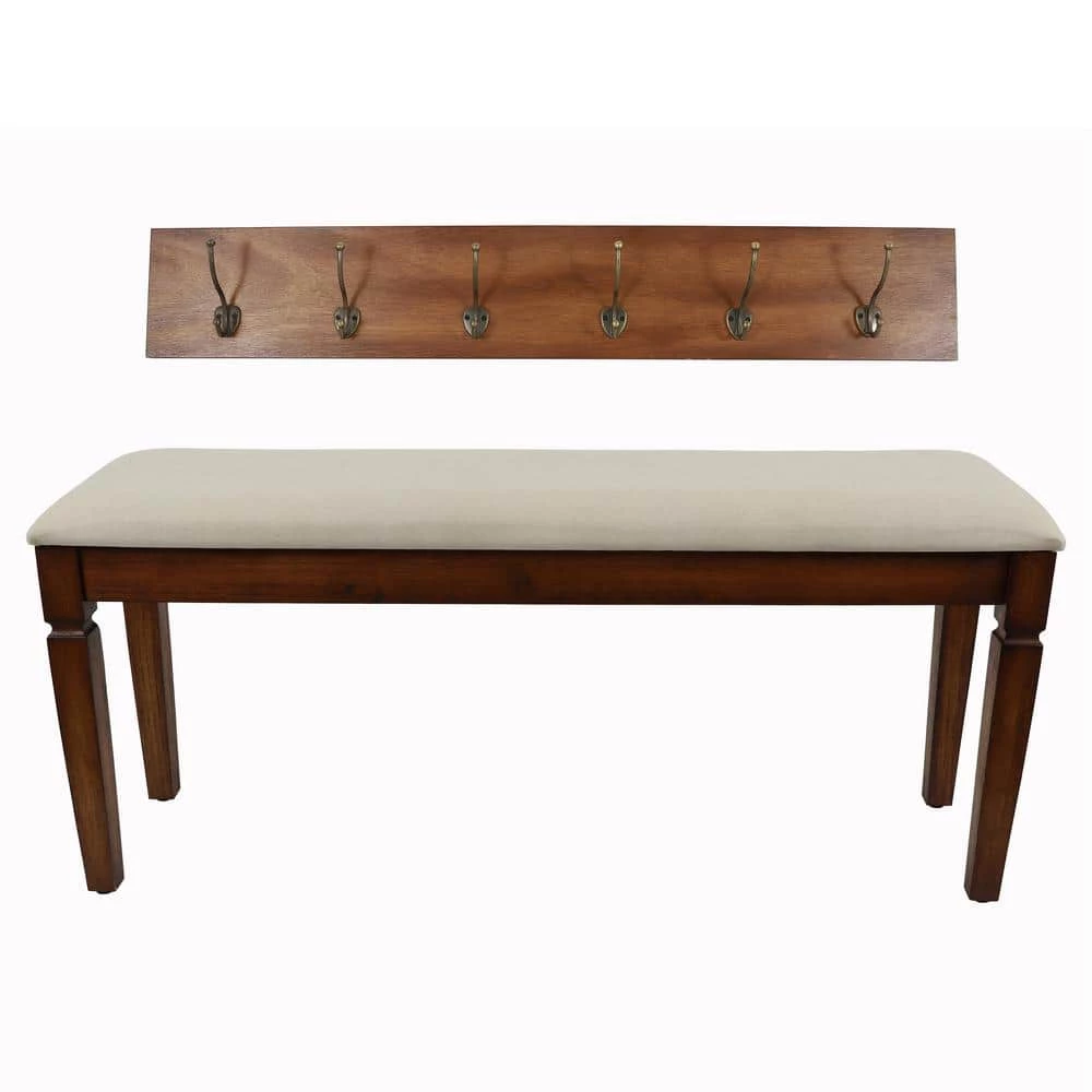 Make your guests feel at home by greeting them with a welcoming entryway. The Waverly Wood Bench and Coat Hook Set makes it simple to create an insta-worthy foyer that is both functional and stylish. The wood framed bench compliments the solid fabric cushion, creating a transitional look and gives your guests a place to rest while taking off their shoes. The coordinating wood coat hook features 6 metal hooks to keep jackets, hats and purses off the floor and tidy. Add a piece of your favorite art to this set and top the bench with a colorful pillow to make this entryway bench set an inviting oasis! Constructed of wood, fabric and metal. Measures 42×11.8×17.75 in.