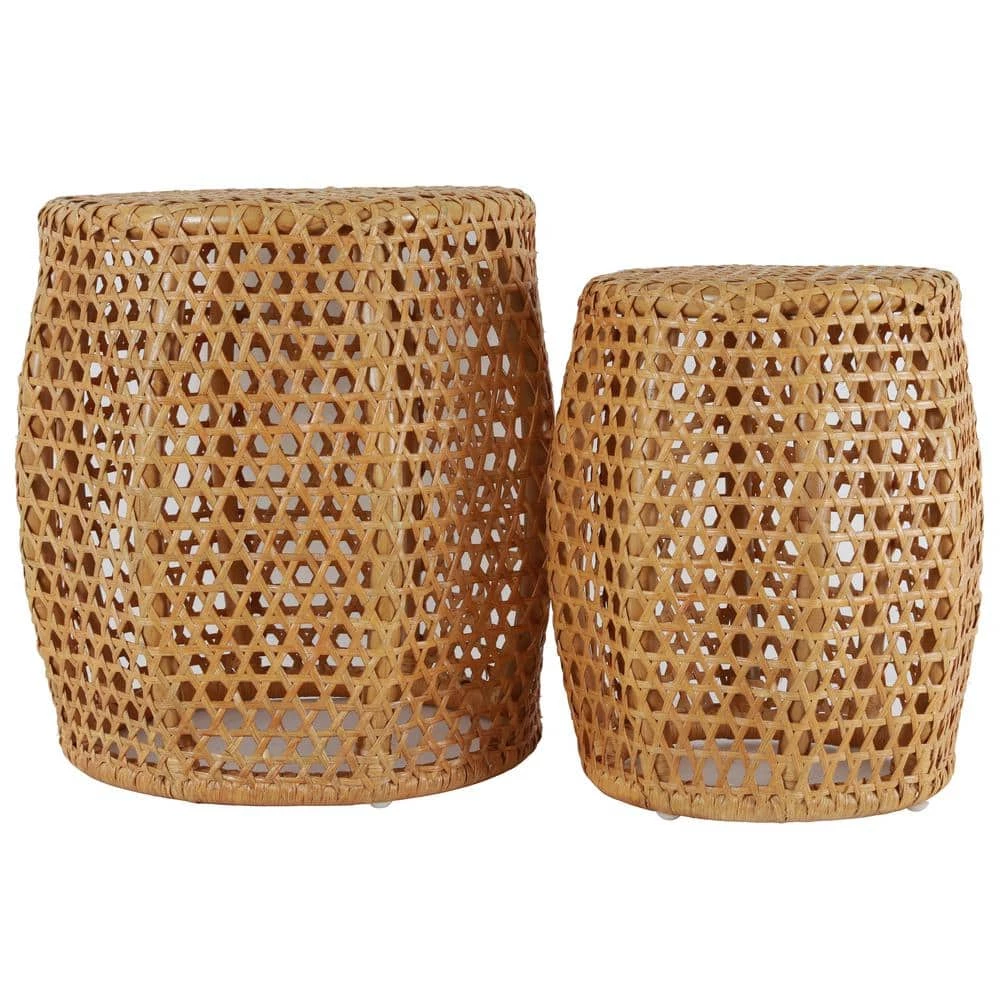Add table top storage with an eclectic flair to your living room or back porch ensemble by placing the Ziggy Nesting Side Table Set next to your outdoor arm chair or sofa. The wood frame and round drum silhouette ensures stability, while the open design highlights the intricacy of the woven rattan. The set of two-doubles your table top storage, ideal for showcasing a table lamp or potted plant. When you need extra space to entertain, simply tuck the smaller accent table into the larger one, maximizing floor space. Indoor or outdoor use. No assembly required. Tables Measure Large: 17.72 in. W x 17.72 in. D x 17.72 in. H. Small: 13.39 in. W x 13.39 in. D x 15.35 in. H.